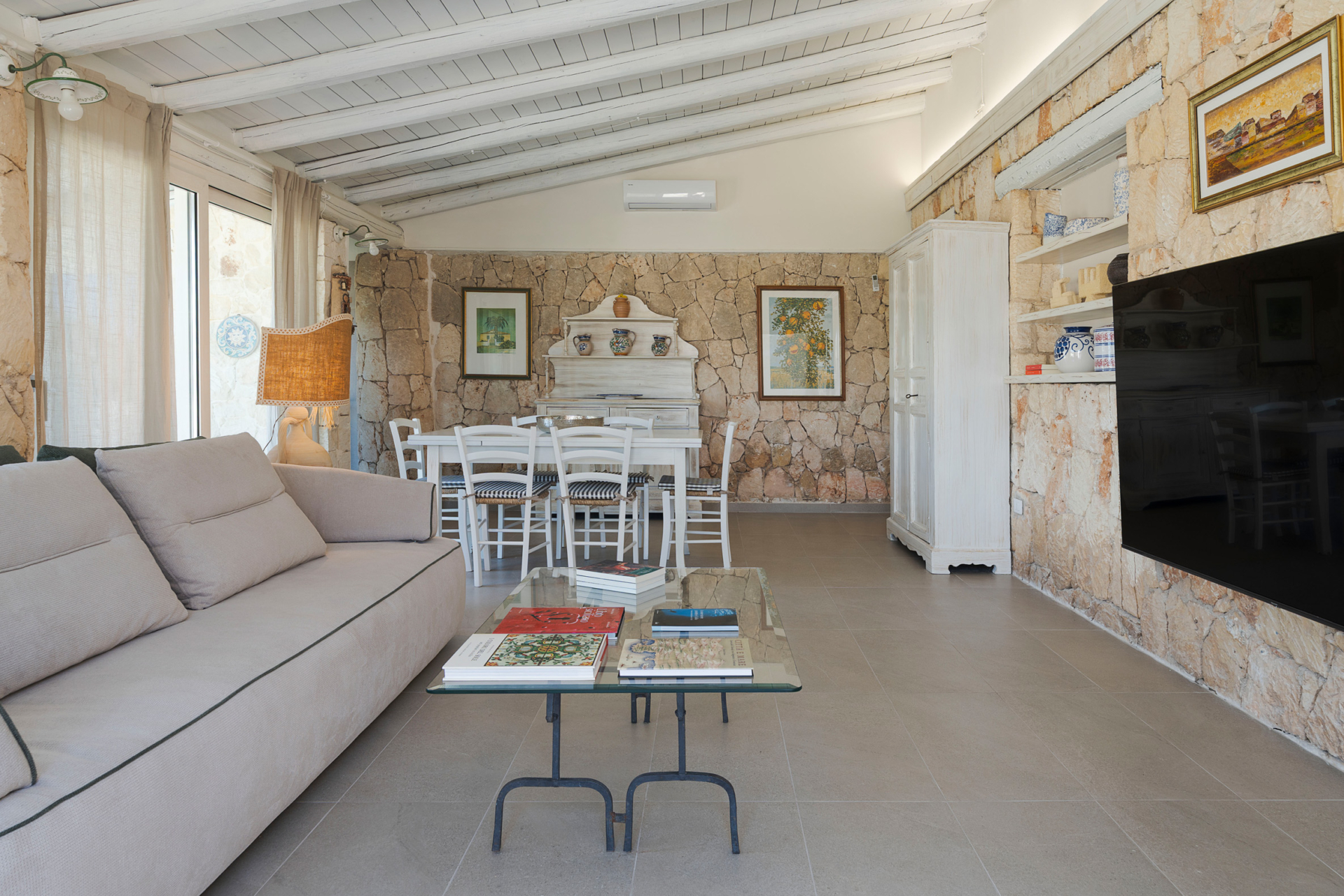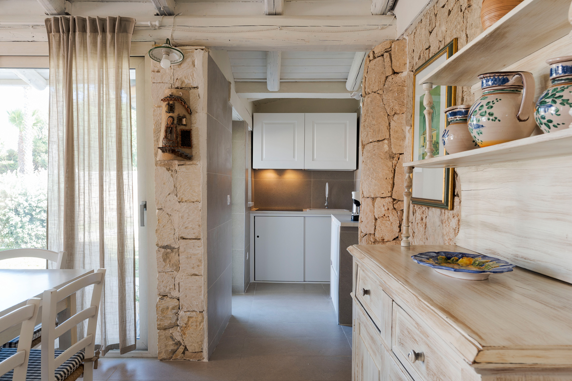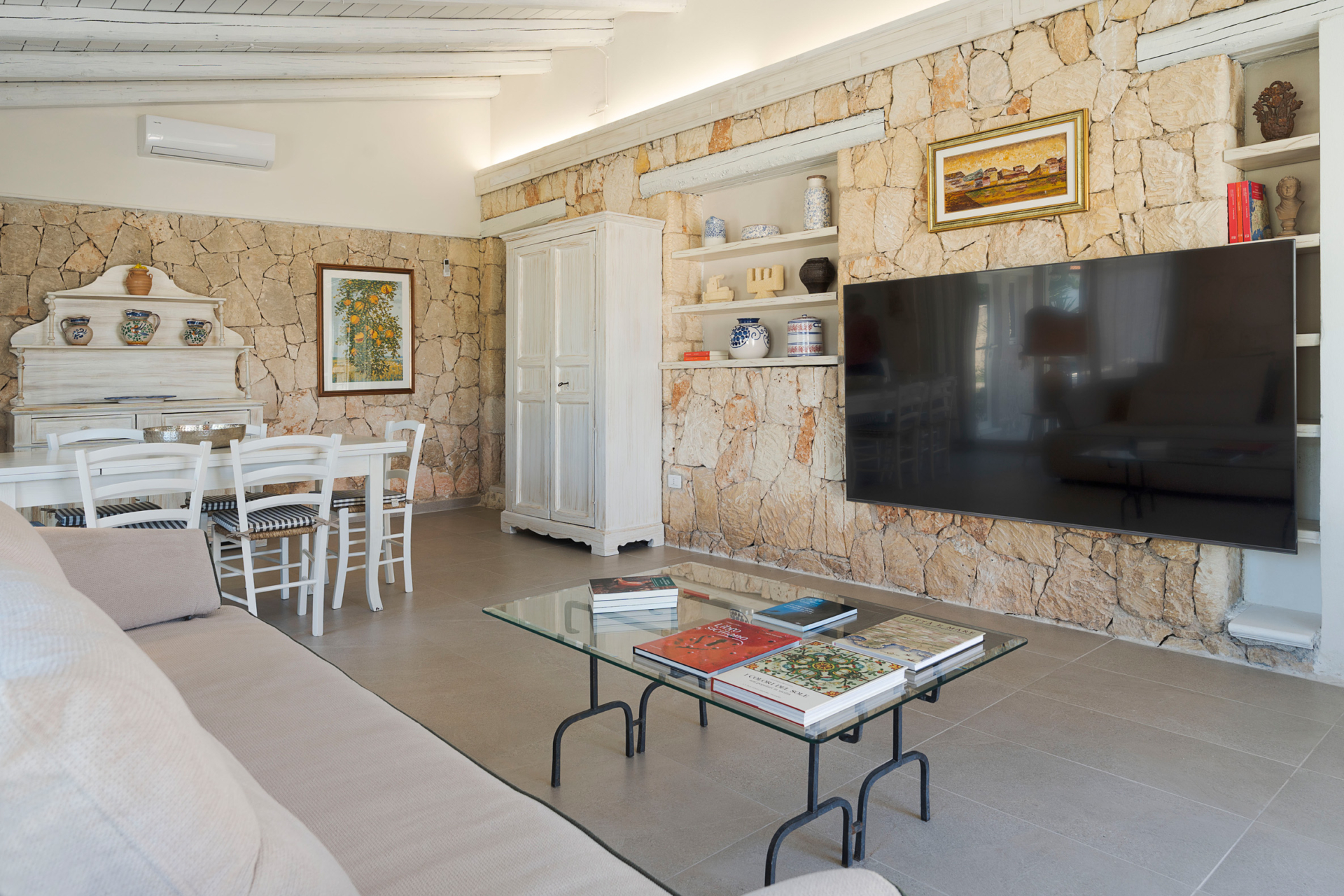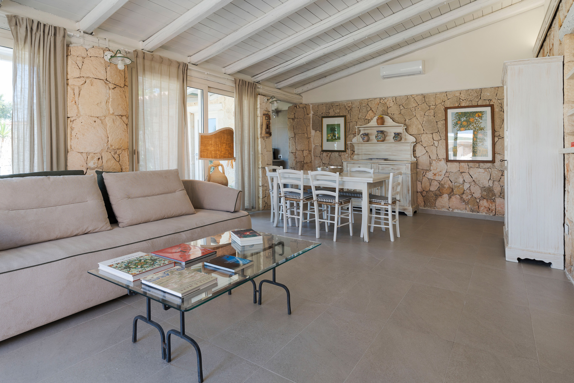 À l’intérieur, la villa se compose de deux unités élégamment aménagées. La maison principale dispose d’un grand salon lumineux, d’une petite cuisine fonctionnelle et de deux chambres avec salle de bains privative. L’annexe, située à quelques pas, propose un salon avec canapé-lit, une kitchenette, une chambre double, une petite chambre et une salle de bains.