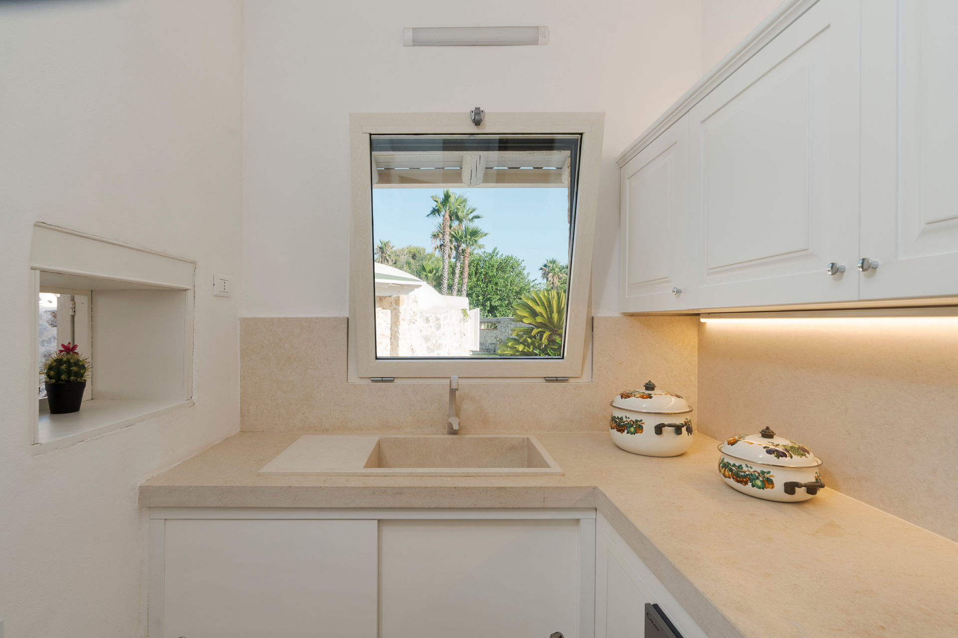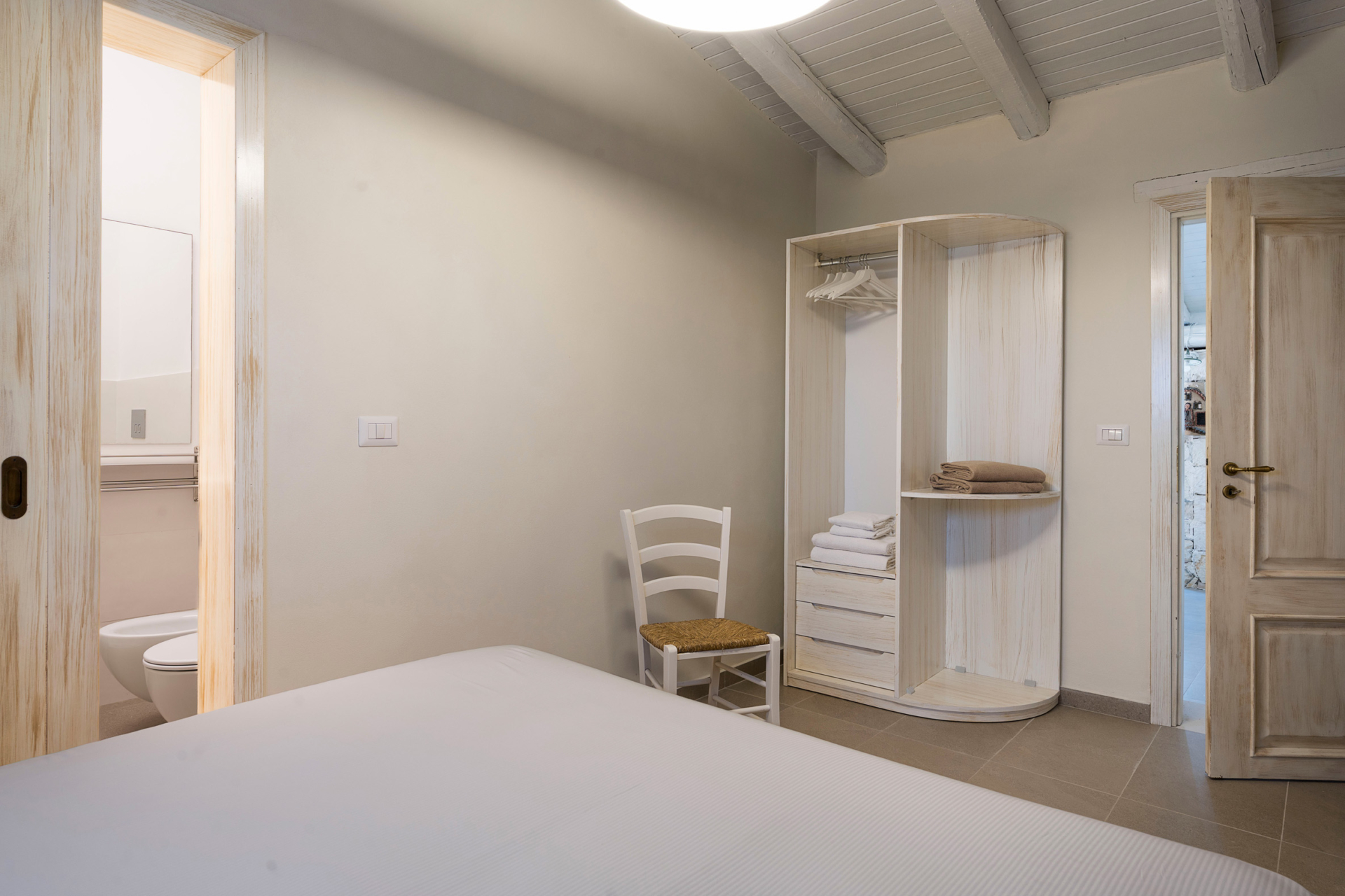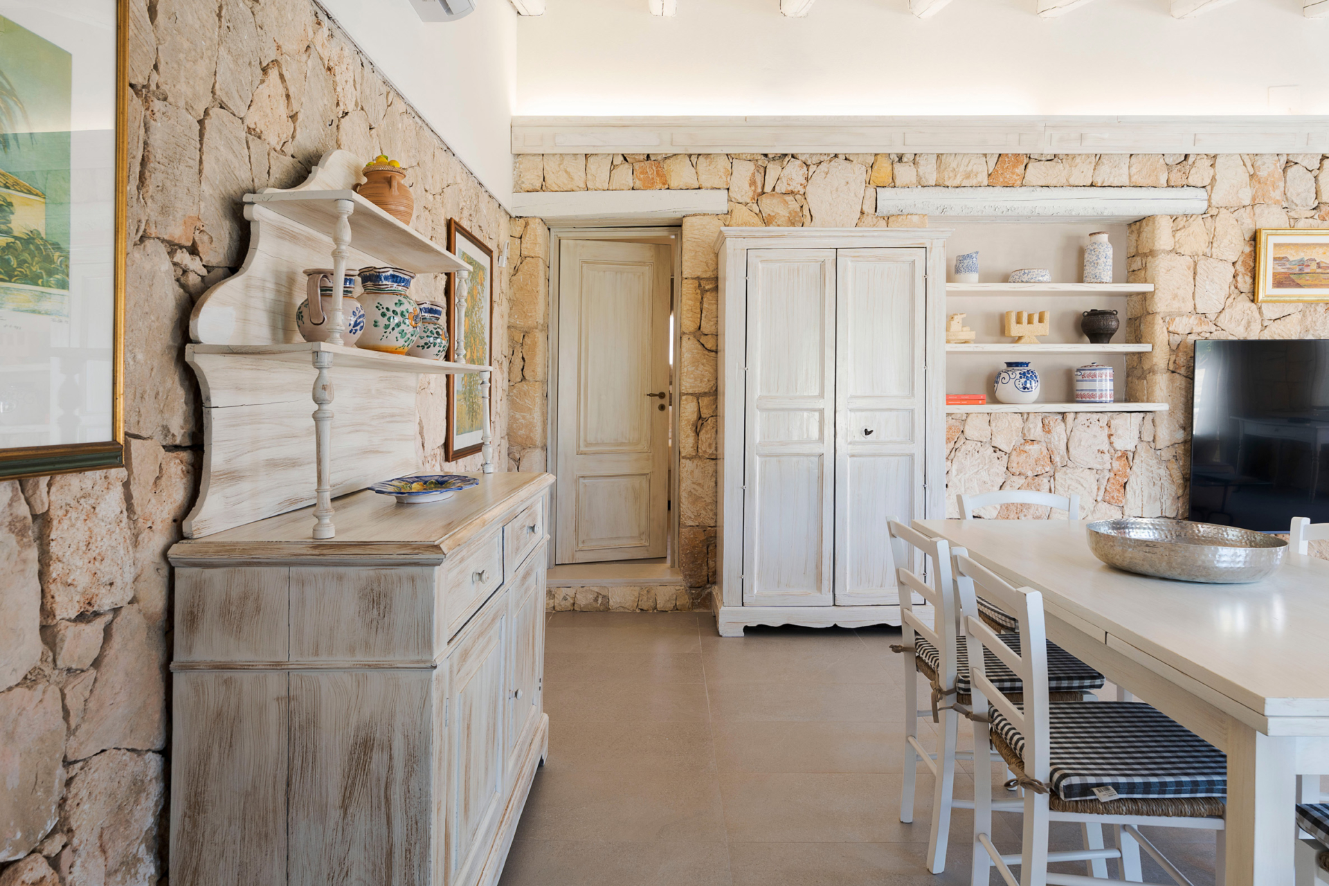 À l’intérieur, la villa se compose de deux unités élégamment aménagées. La maison principale dispose d’un grand salon lumineux, d’une petite cuisine fonctionnelle et de deux chambres avec salle de bains privative. L’annexe, située à quelques pas, propose un salon avec canapé-lit, une kitchenette, une chambre double, une petite chambre et une salle de bains.