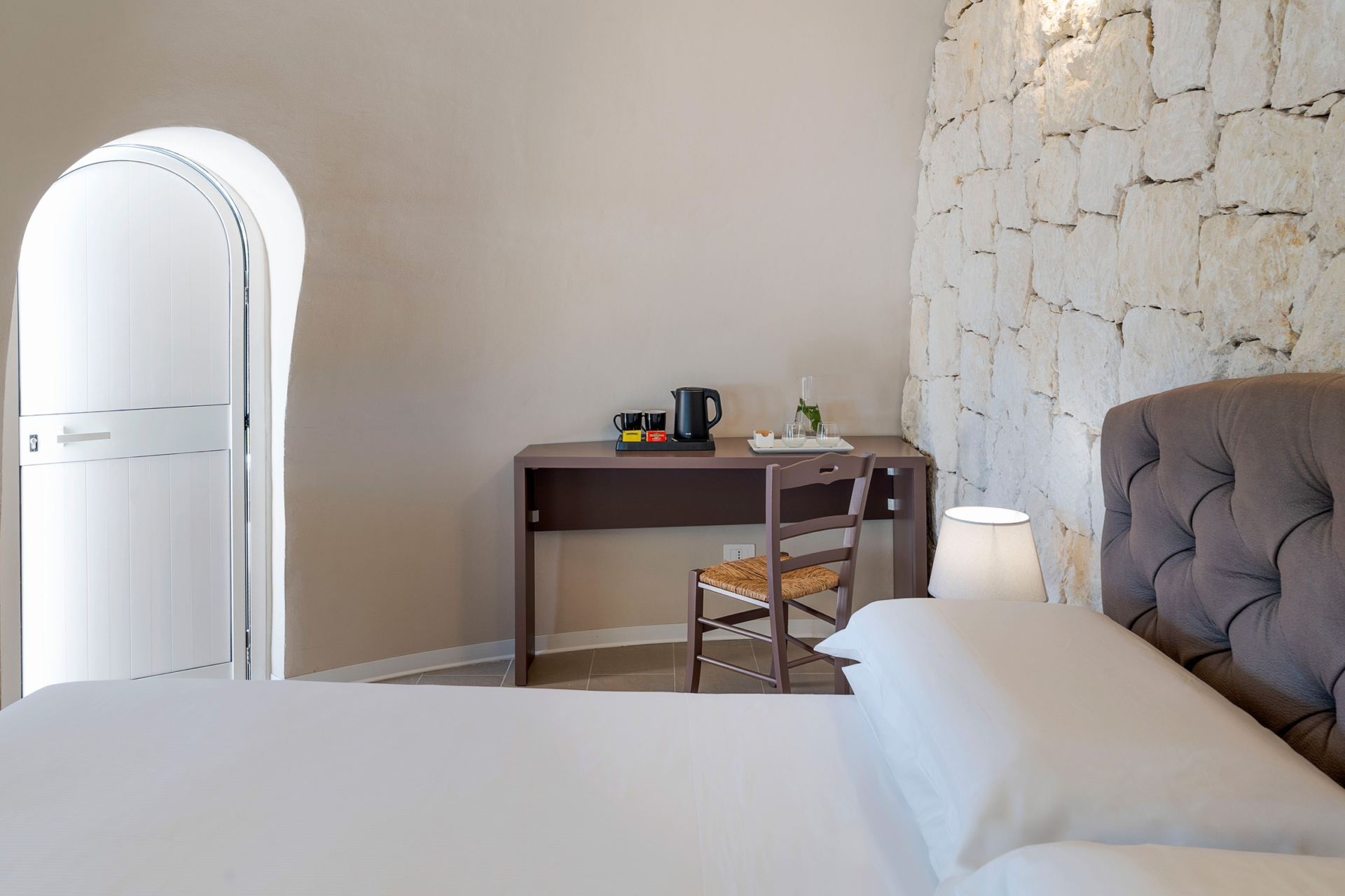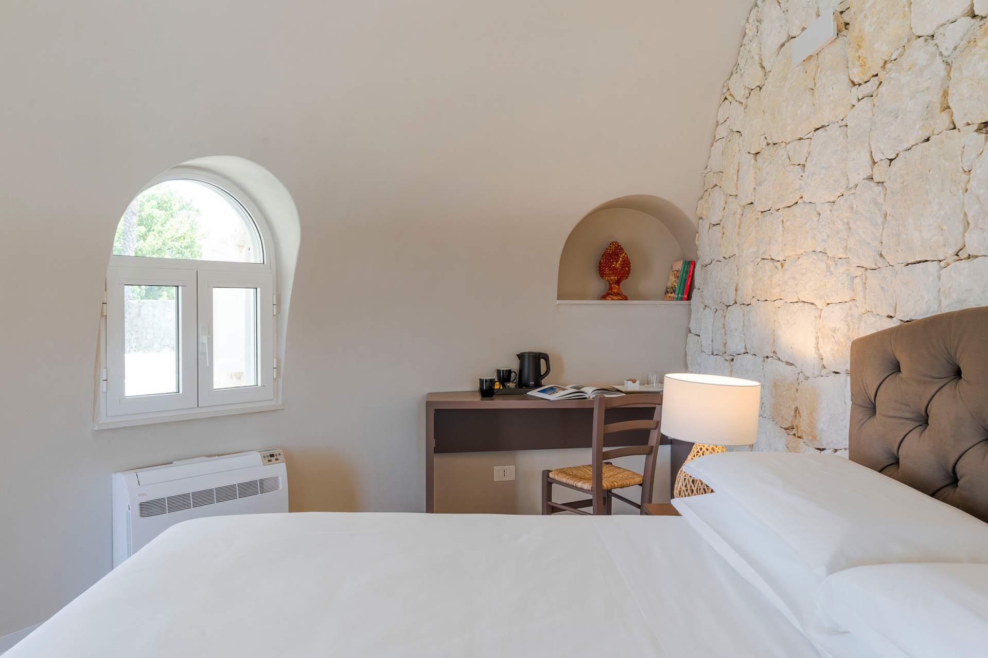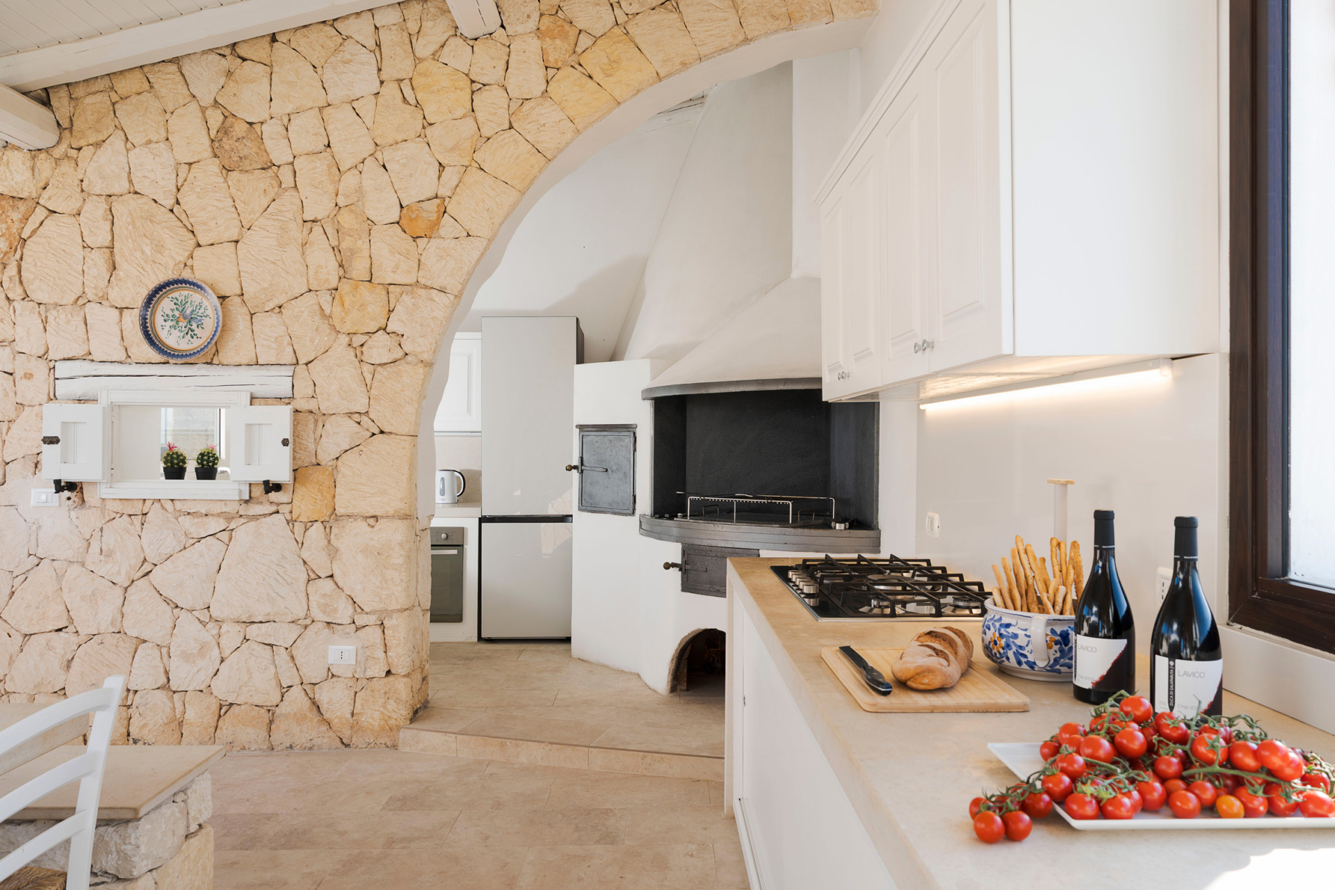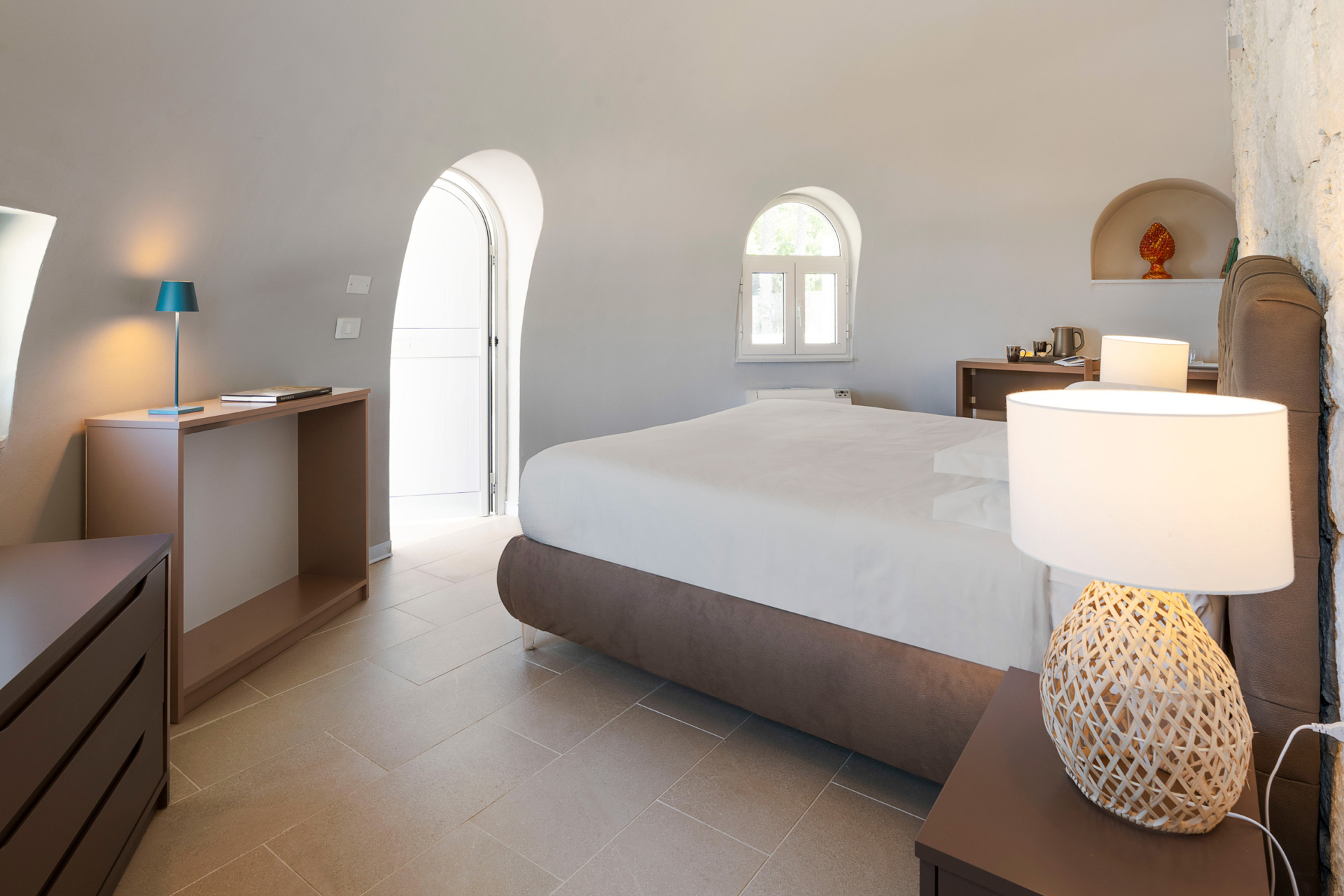 À l’intérieur, la villa se compose de deux unités élégamment aménagées. La maison principale dispose d’un grand salon lumineux, d’une petite cuisine fonctionnelle et de deux chambres avec salle de bains privative. L’annexe, située à quelques pas, propose un salon avec canapé-lit, une kitchenette, une chambre double, une petite chambre et une salle de bains.