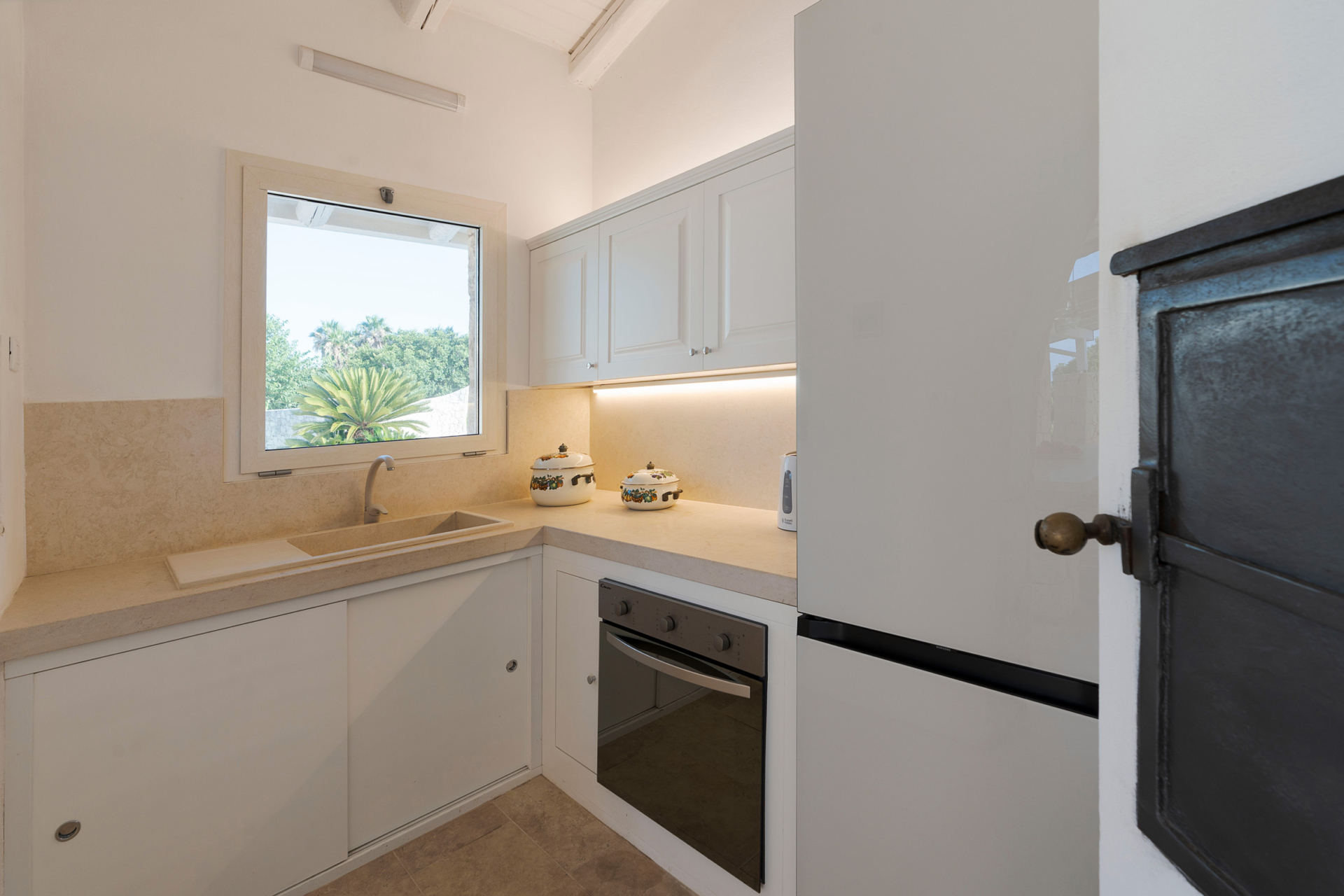 Cuisine avec four électrique, bouilloire, réfrigérateur, grille pain, lave vaisselle, cafetière, four micro ondes, machine à expresso
