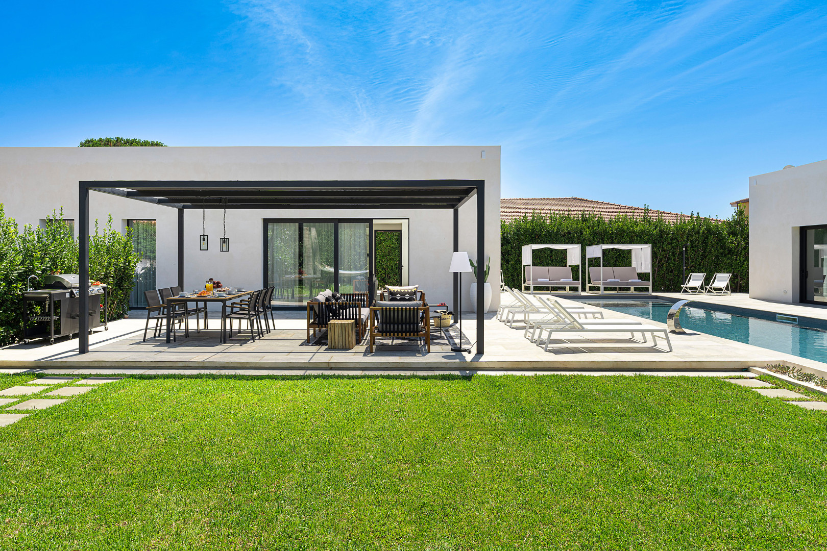 À l’extérieur, la villa est pensée pour offrir un art de vivre au grand air. Les terrasses aménagées invitent à se prélasser ou à partager des repas conviviaux en plein air. La piscine avec ses 15 mètres de long est la véritable pièce maîtresse qui relie les deux bâtiments qui composent la propriété. Chaque coin extérieur a été conçu pour favoriser le repos et la convivialité, tout en profitant du climat généreux de la région.