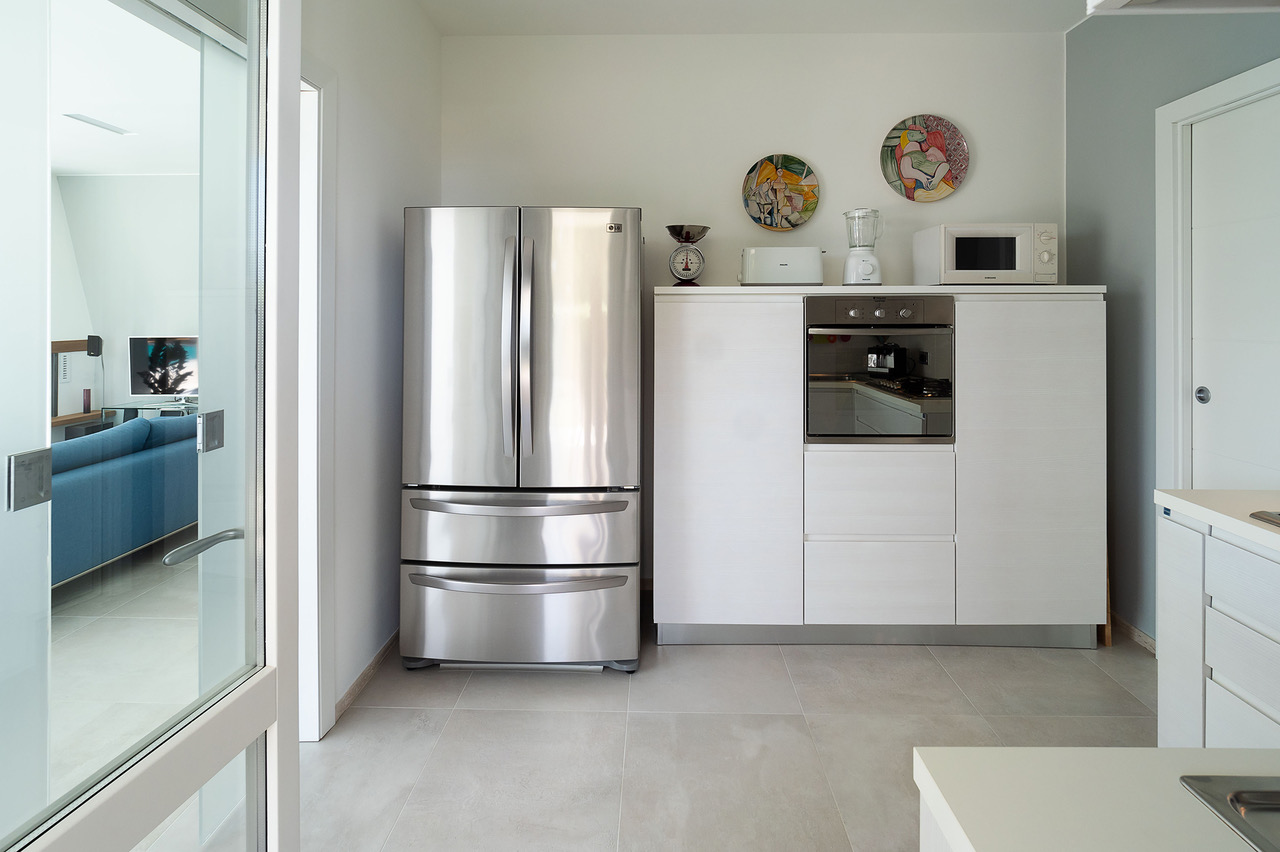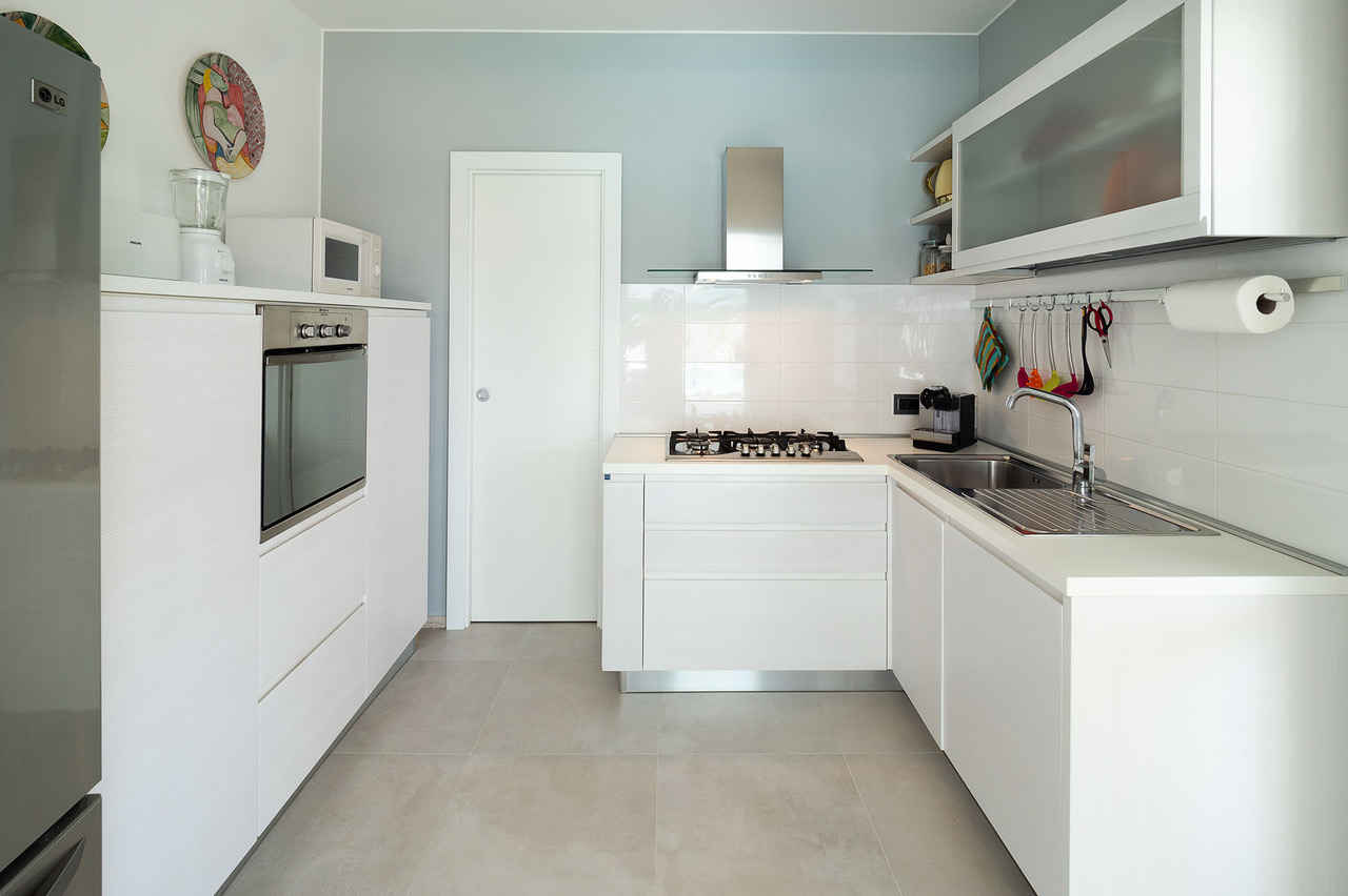 Cuisine avec four électrique, table de cuisson à gaz, lave vaisselle, four micro ondes, grille pain