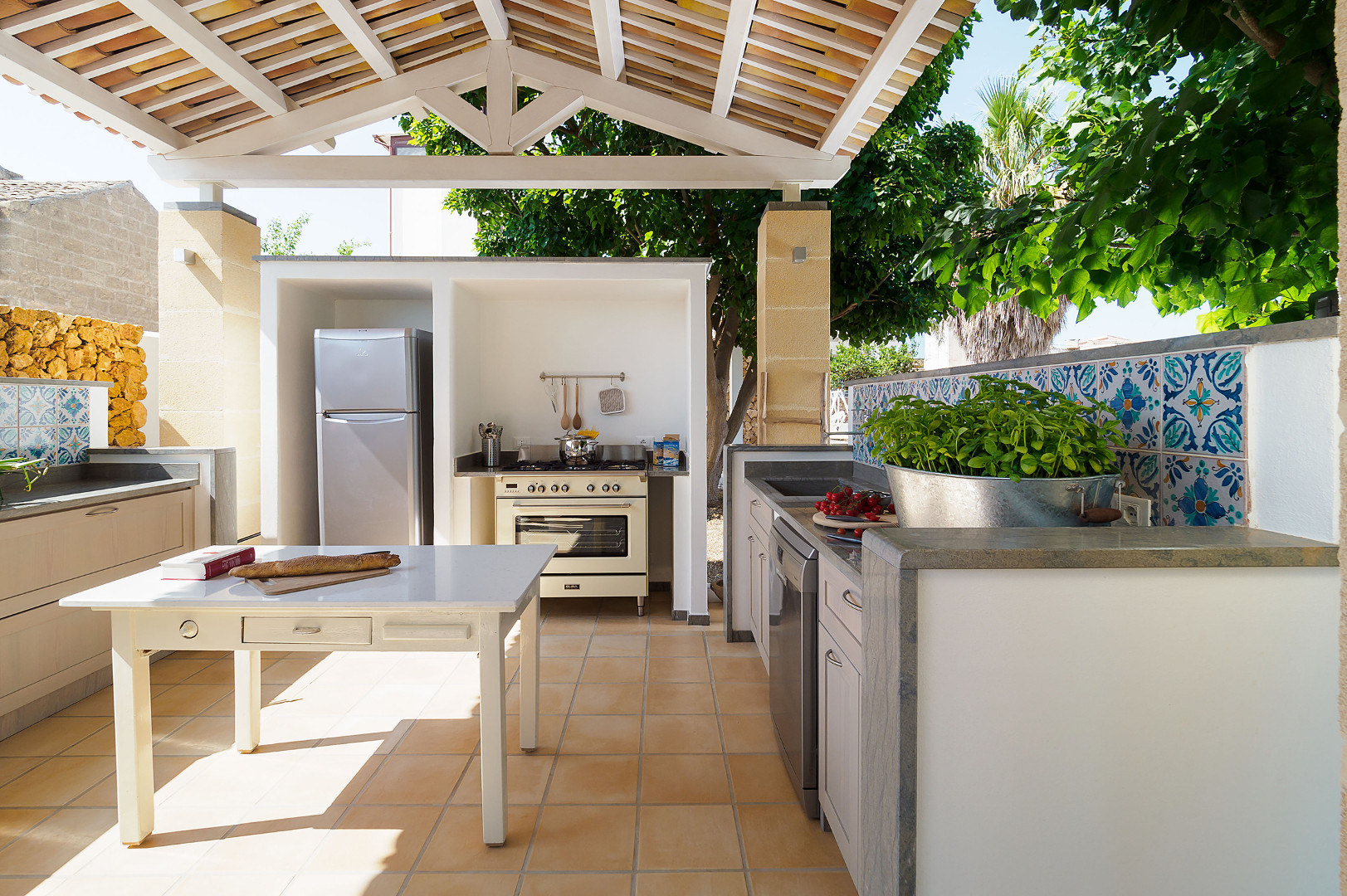 Terrasse couverte et aménagée et Cuisine extérieure avec four électrique, barbecue, table de cuisson à gaz, réfrigérateur