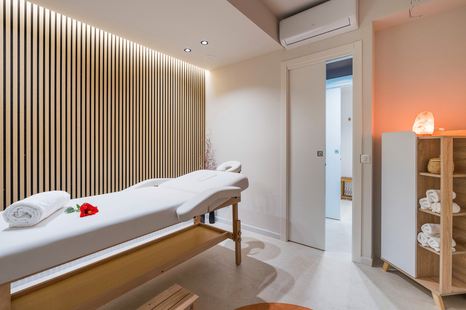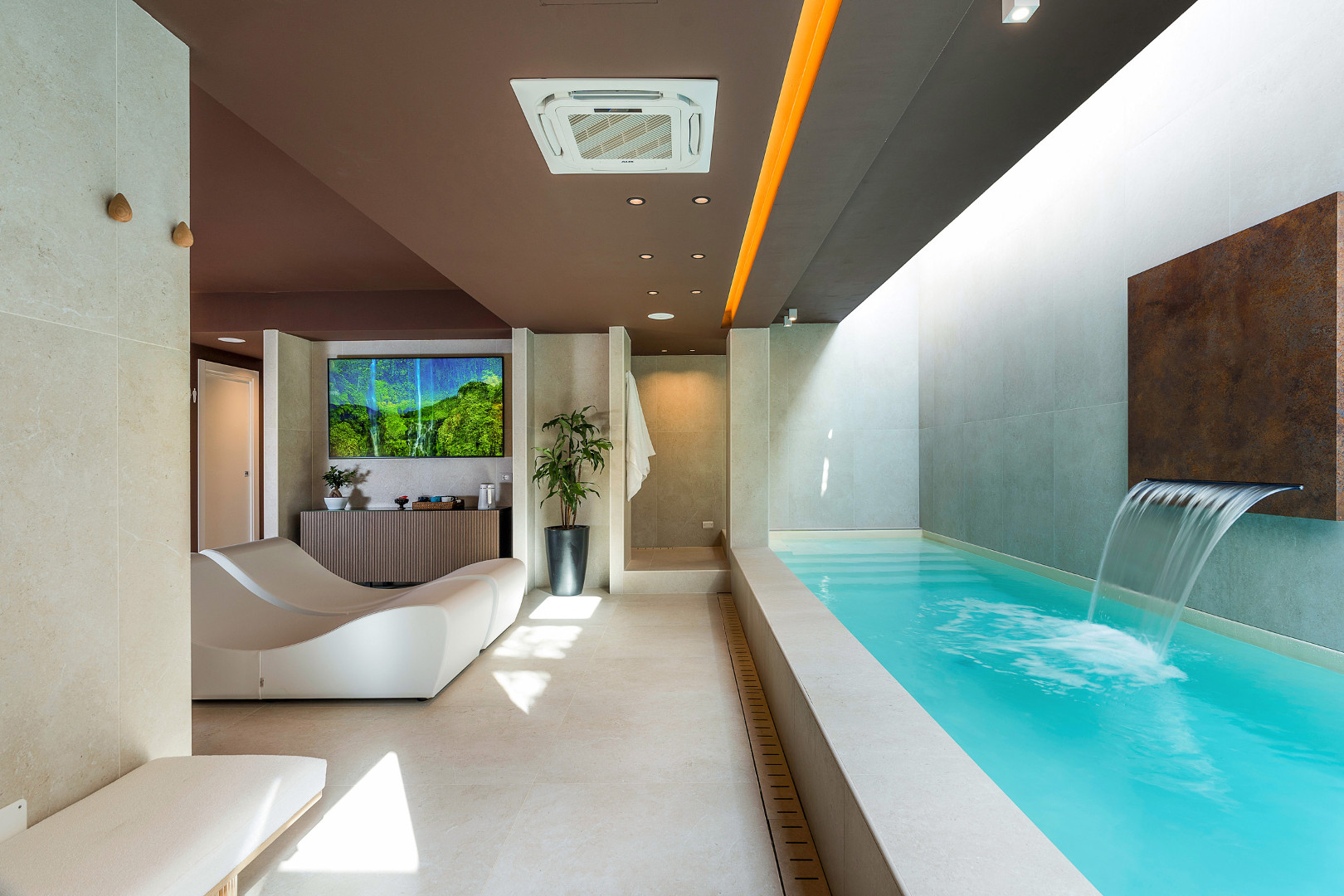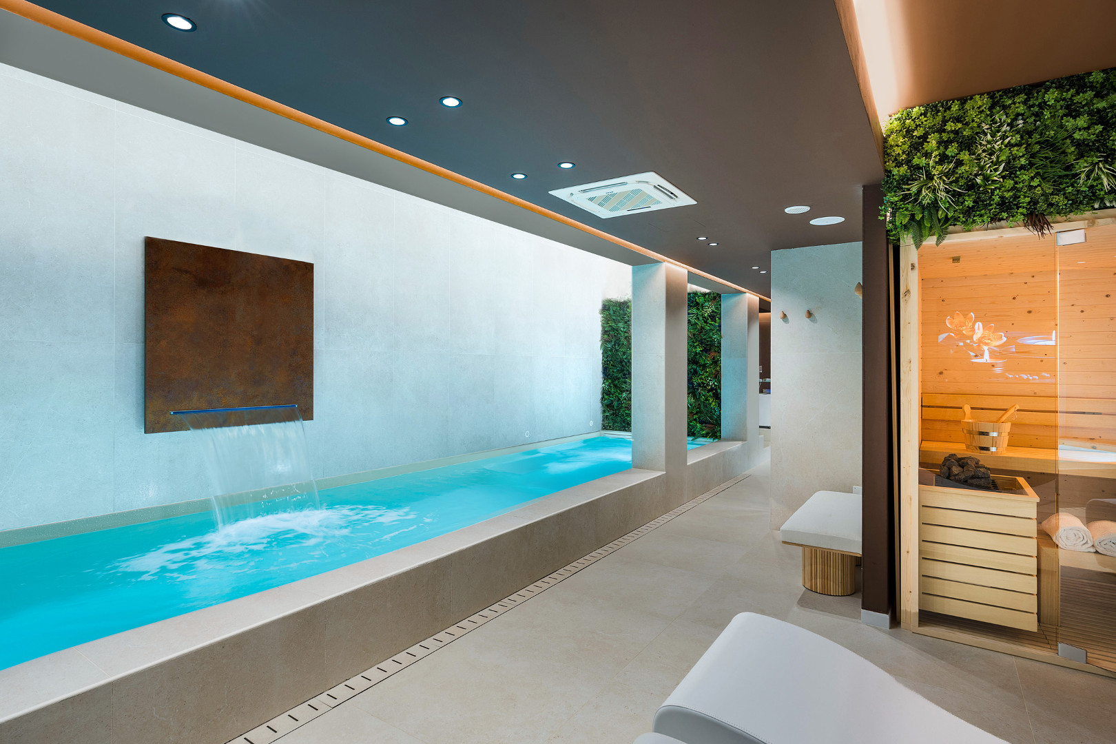 Spa avec piscine intérieure chauffée avec cascade et hydromassage, douche émotionnelle, tisanerie et espace détente, salle de massage, 2 salles de bains, 2 douches.