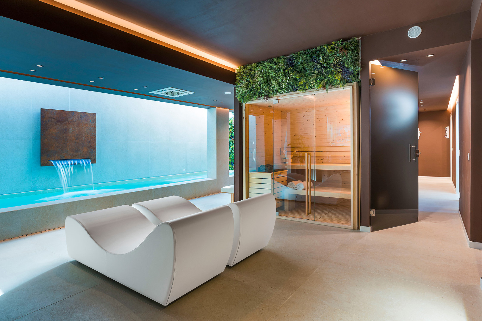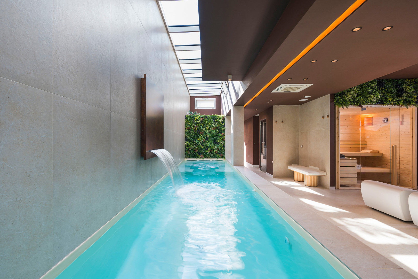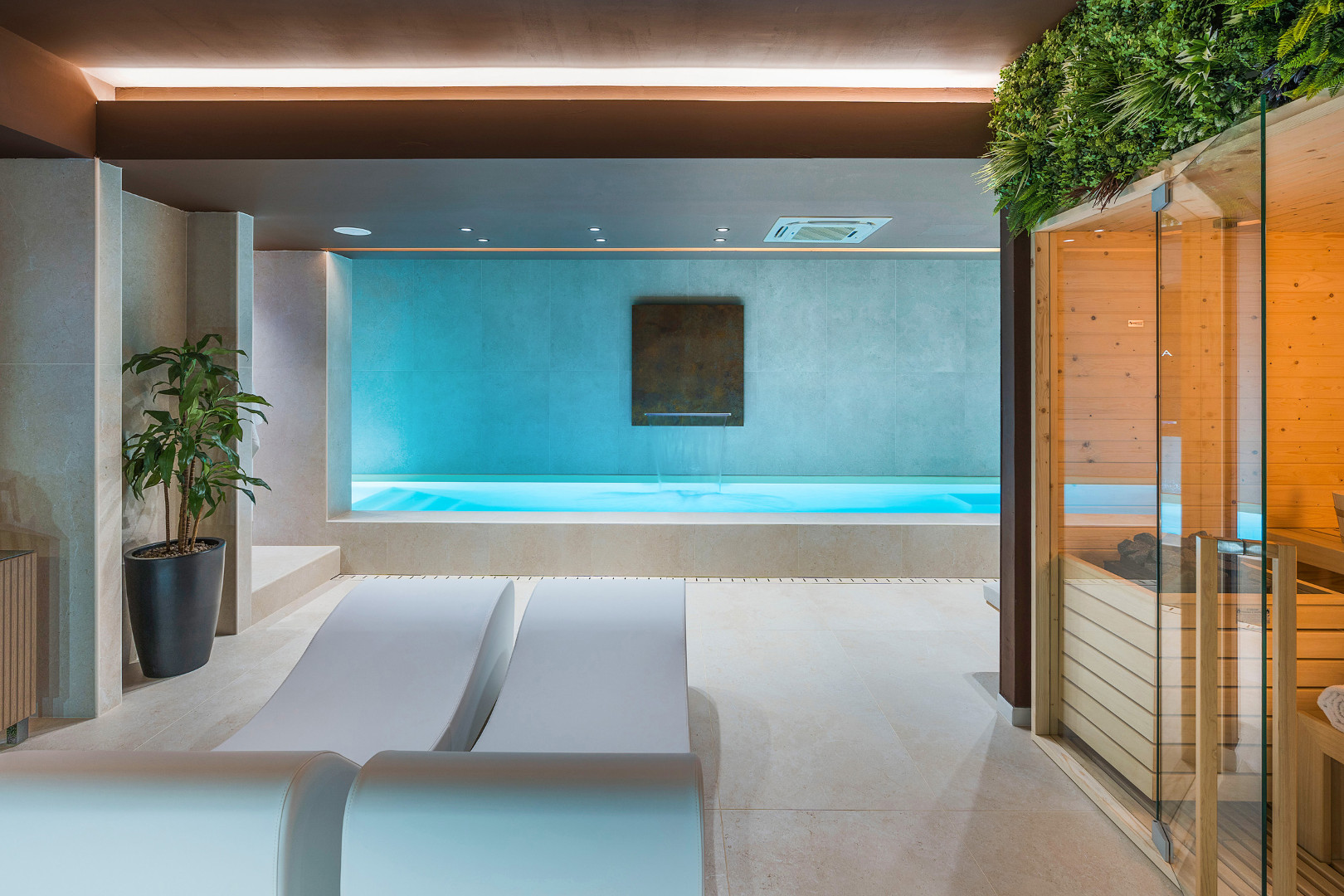 Spa avec piscine intérieure chauffée avec cascade et hydromassage, douche émotionnelle, tisanerie et espace détente, salle de massage, 2 salles de bains, 2 douches.