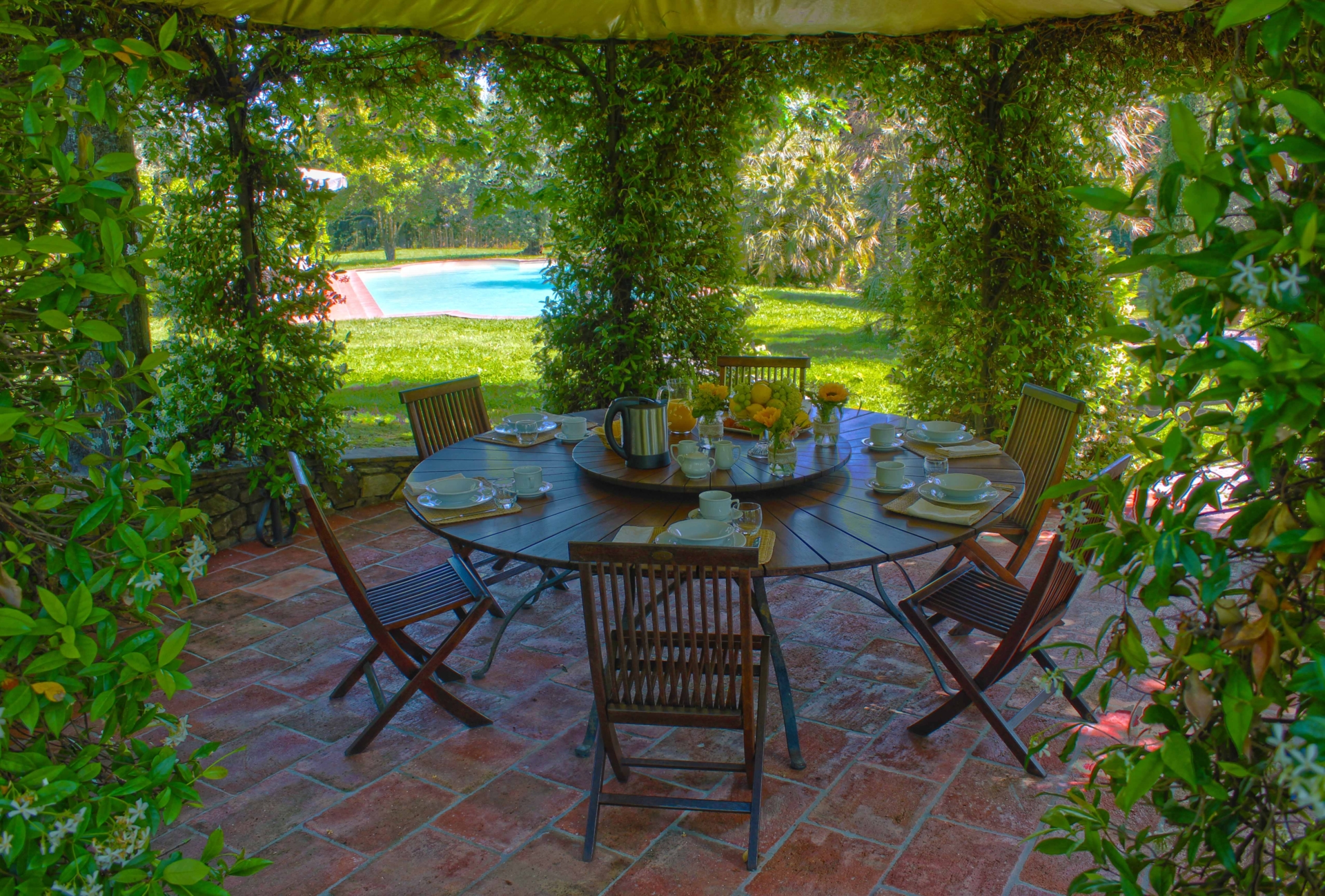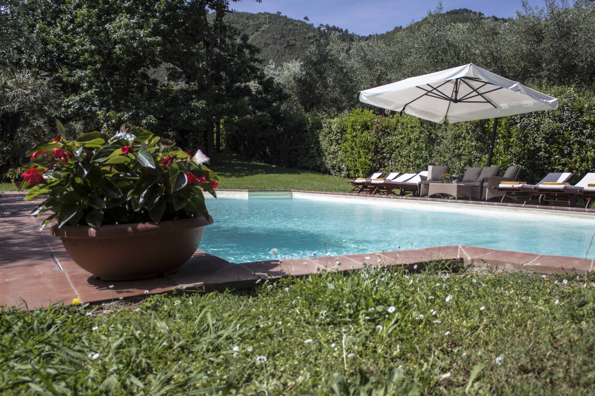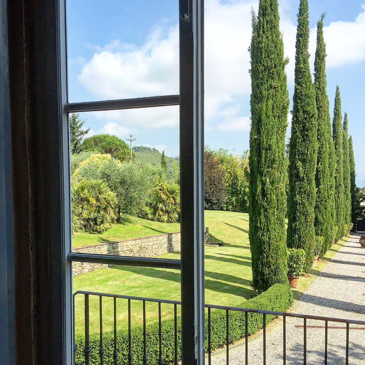 Une fois passé le portail de la propriété, un véritable décor de carte postale s’offre à vous et rappelle les fastes d’antan. Une allée bordée de cyprès, une somptueuse demeure du 18ème siècle entourée d’un jardin à l’italienne, et en arrière plan les montagnes et collines de Lucca.