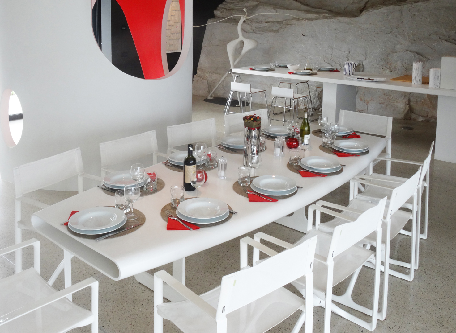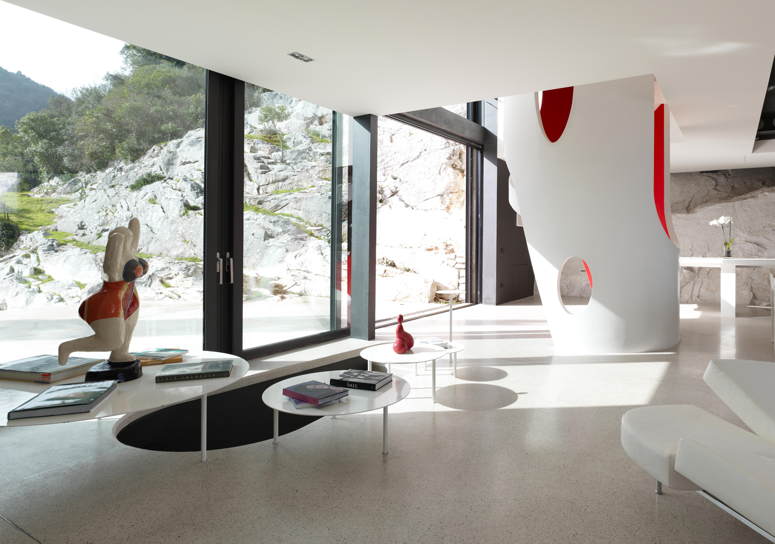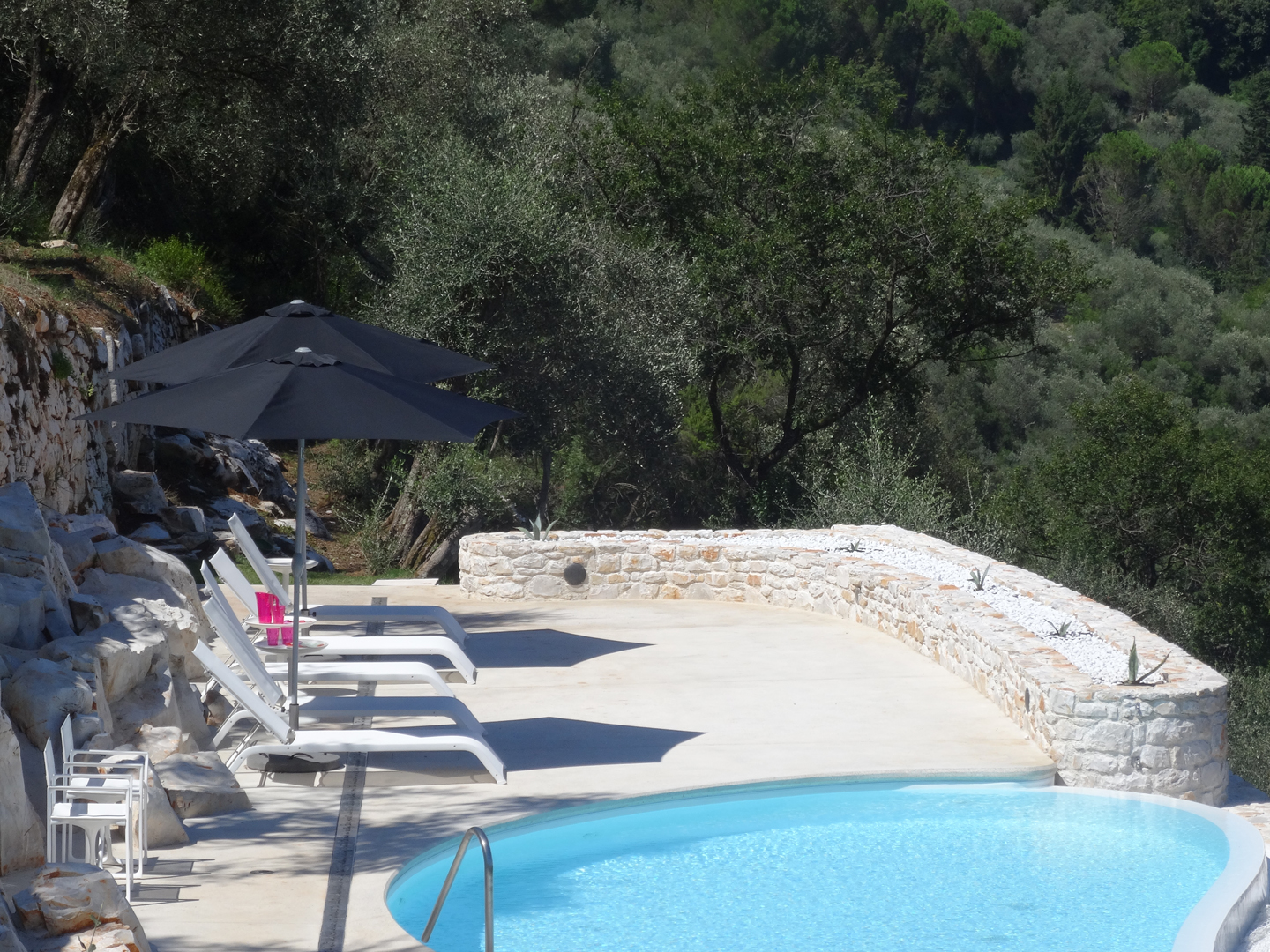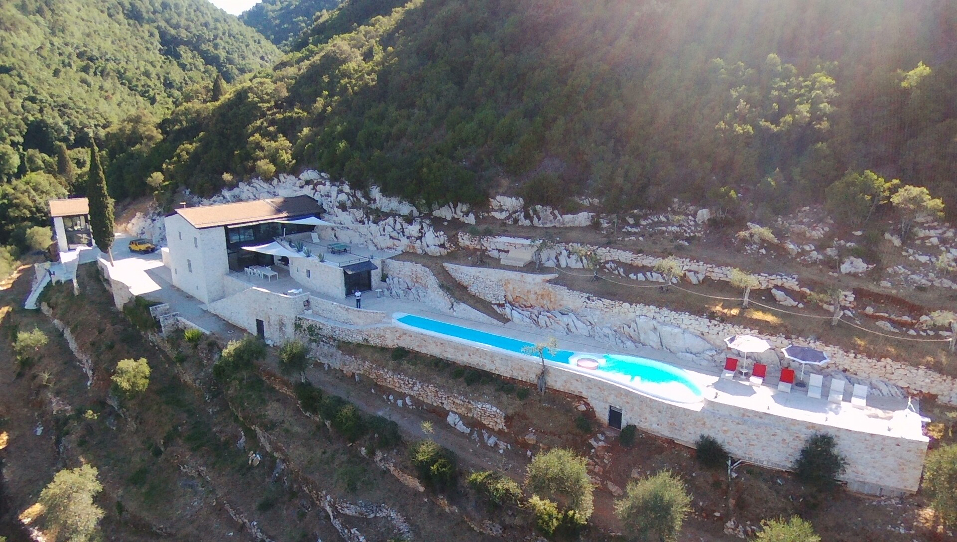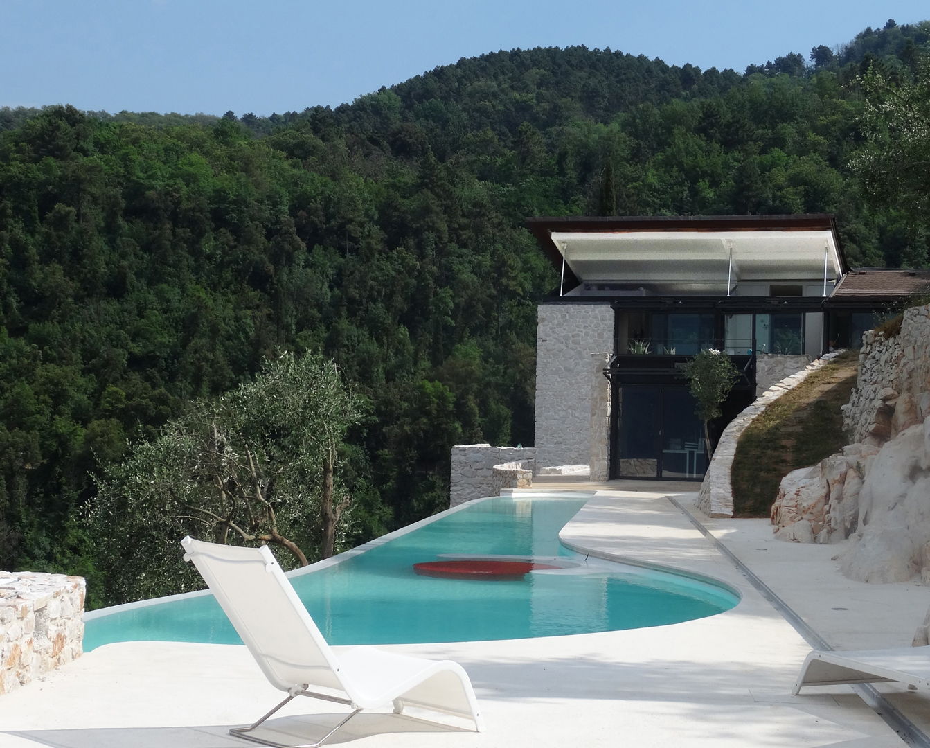 La demeure tout étant innovatrice a été bâtie avec des matériaux locaux et se fond à la perfection dans son écrin boisé en communion totale avec la nature. Laissez-vous émerveiller par le soin apporté aux détails, aux sculptures faites sur mesure, à l’escalier et à la piscine étonnante (26 m x 2,7 m) en flanc de falaise.