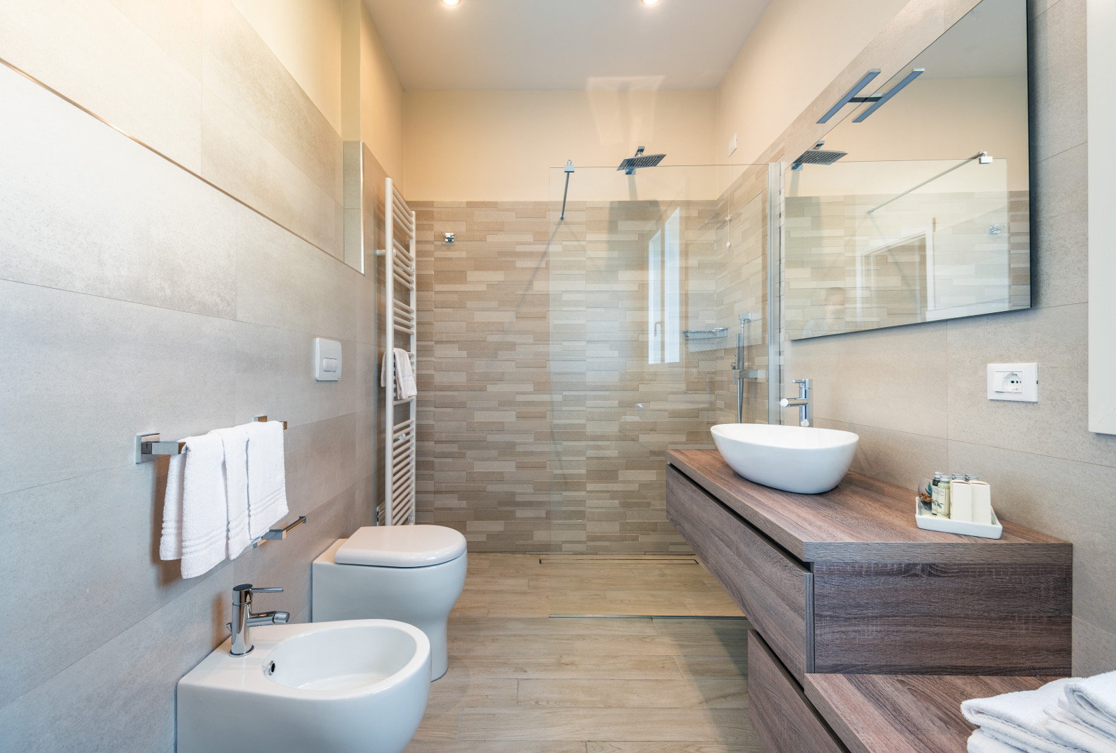 Chambre double adaptée pour les personnes à mobilité réduite avec accès jardin, coffre fort et Salle de bain en suite avec douche, sèche cheveux