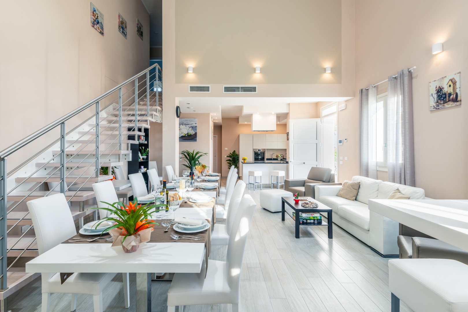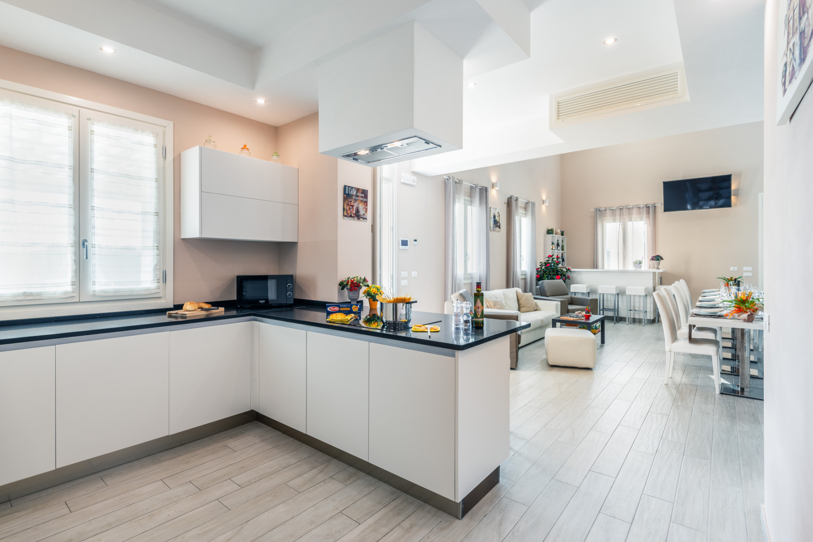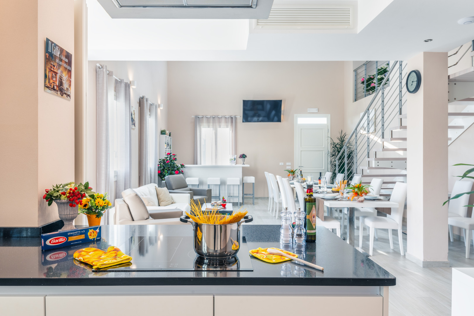 Cuisine ouverte avec lave vaisselle, plaques à induction, four électrique, bouilloire, machine à expresso, machine à glacons et Terrasse aménagée avec barbecue