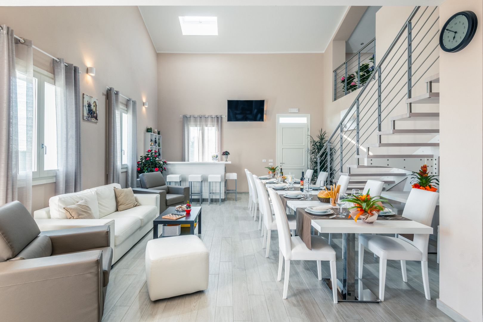 Salon - salle à manger avec tables modulables pouvant accueillir 16 personnes et Coin bar aménagé avec télévision plasma