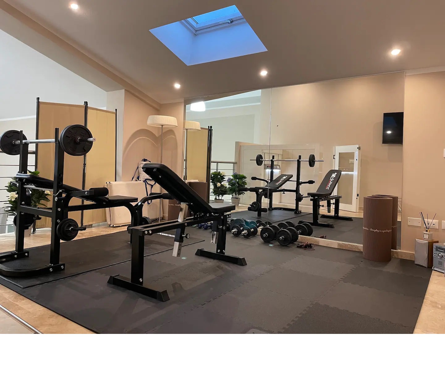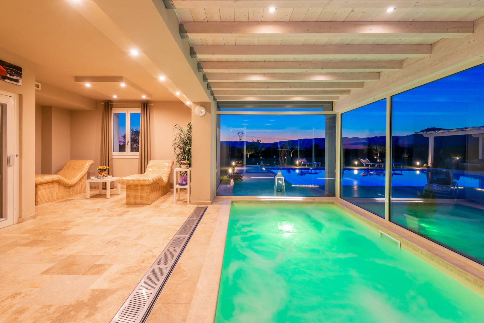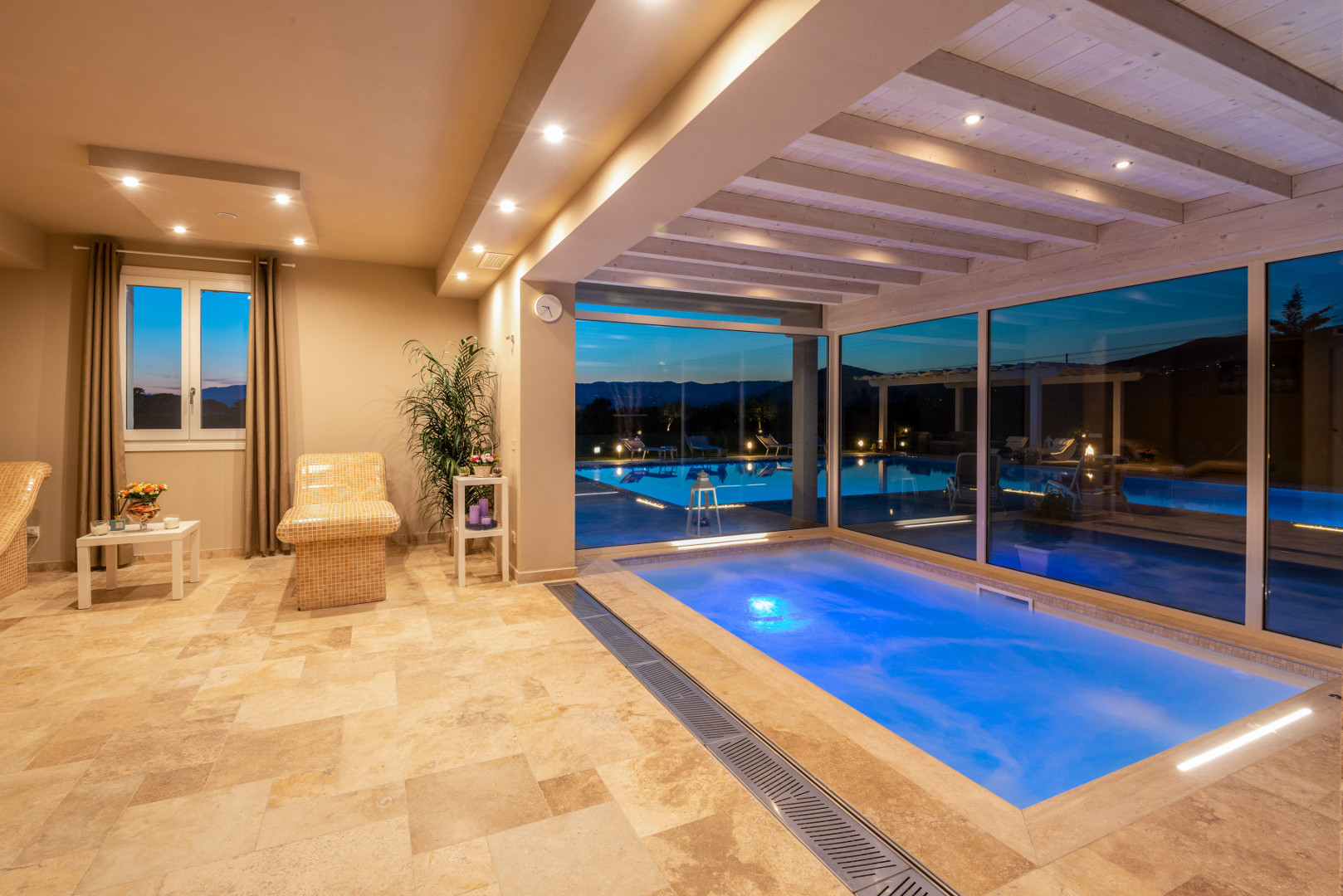 Spa avec grandes baies vitrées offrant une vue à couper le souffle sur la superbe piscine en forme de L (12m * 4m / 11m * 6m) jusqu’aux collines environnantes avec jacuzzi, hammam, sauna, douche, transat thermique et Salle de Bain avec douche et Vestiaire et Salle de Bain avec douche et Salle de Gym en mezzanine accessible uniquement par ascenseur depuis le spa avec appareils de fitness