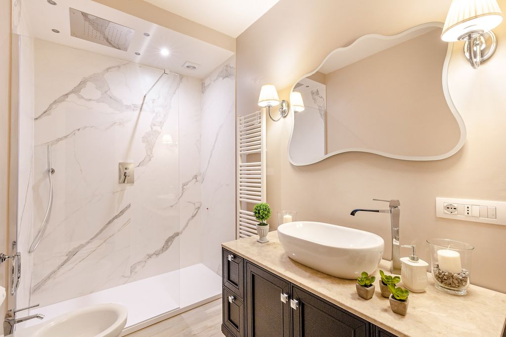Chambre double et Salle de bain en suite avec douche, sèche cheveux