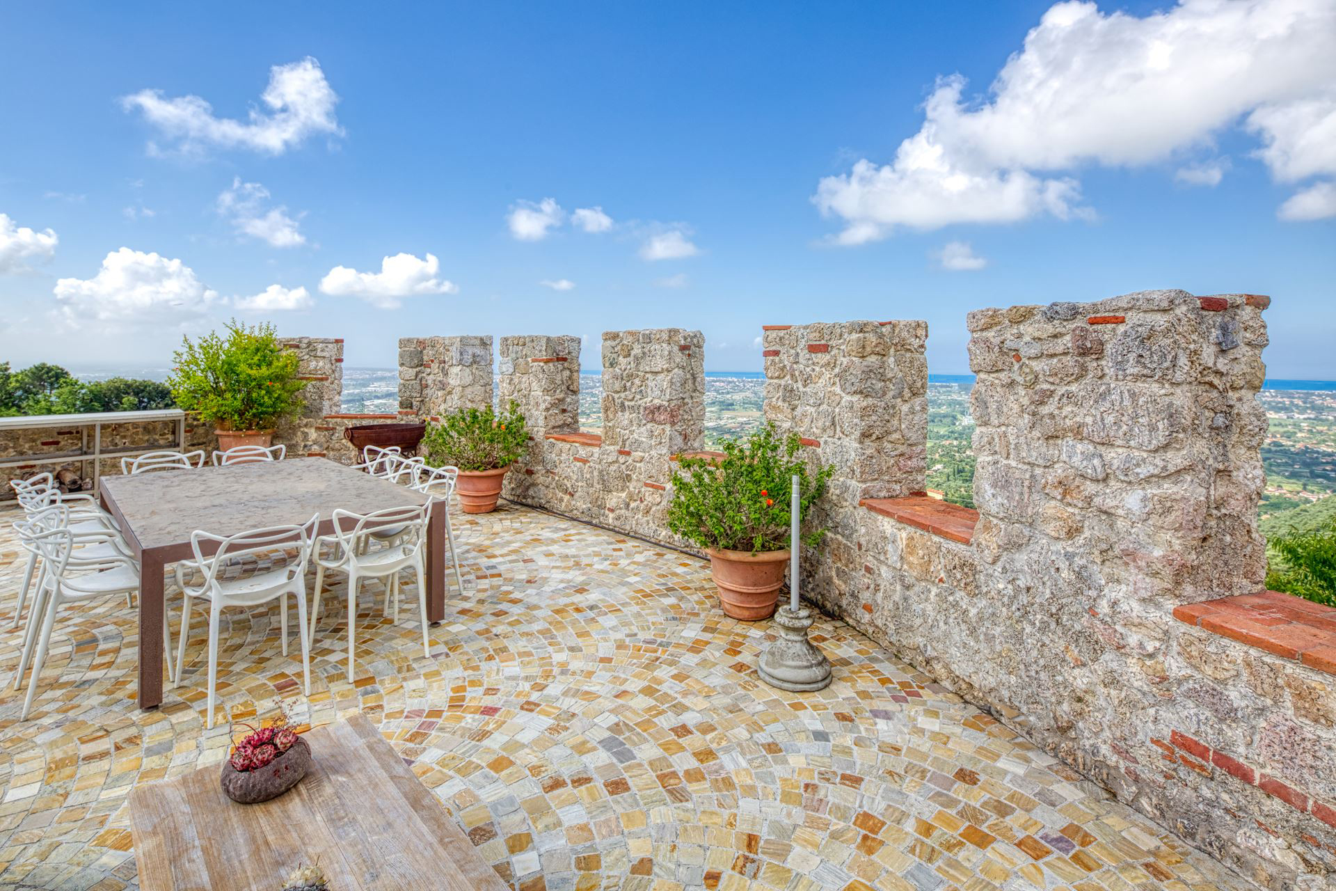 Dehors, les nombreuses terrasses situées sur différents niveaux sont parfaitement équipées pour en profiter au maximum. Table pour les repas, fauteuils et table basse pour prendre un verre, transats autour de la piscine privée chauffée pour bronzer. Le tout entouré d’une végétation luxuriante. Depuis la terrasse la plus haute, la vue est à couper le souffle. On y admire un panorama exceptionnel : d’un côté le village et les collines, et de l’autre le plat paysage menant jusqu’à la mer au loin.