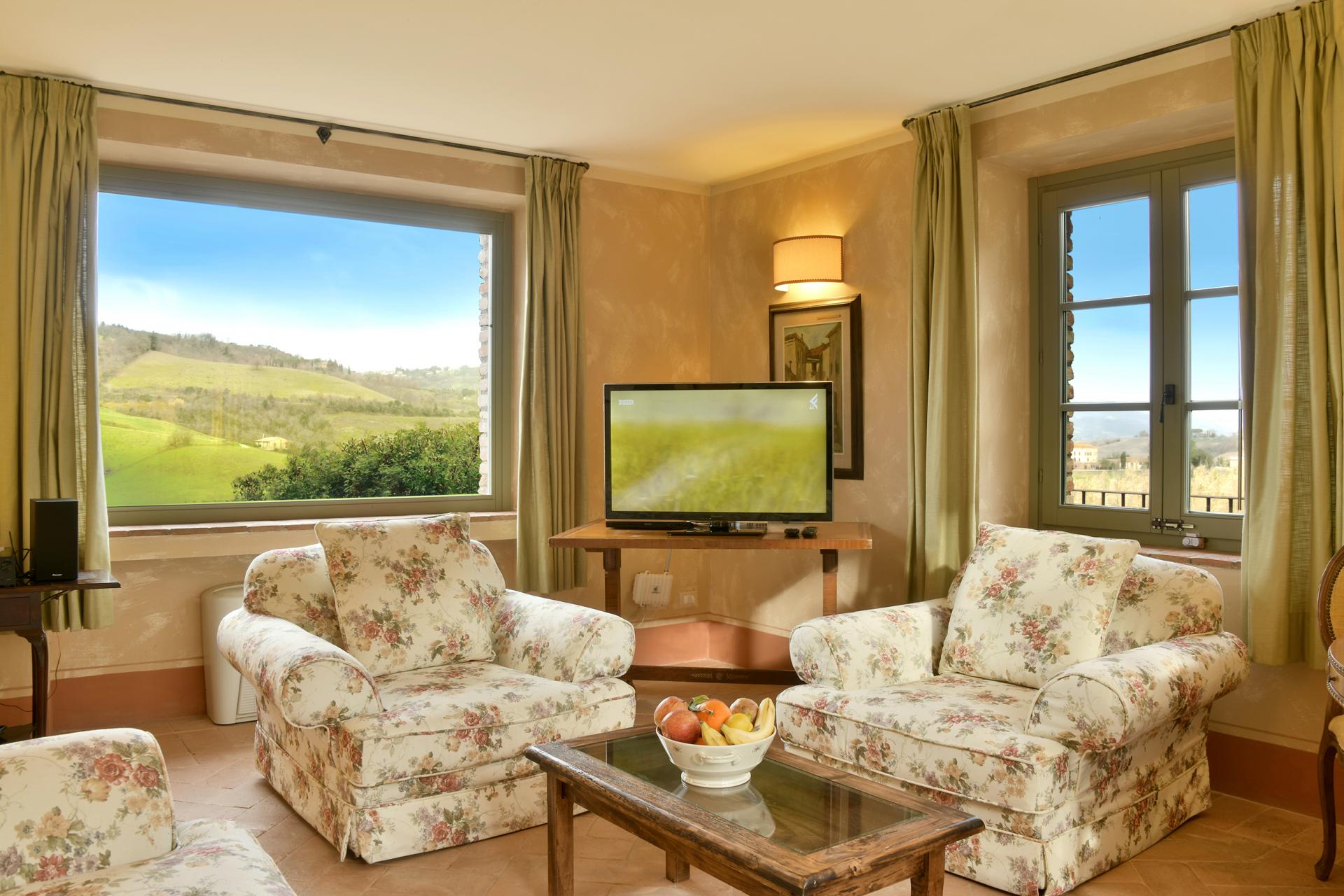 Salon superbe vue de carte postale sur les collines du domaine avec télévision