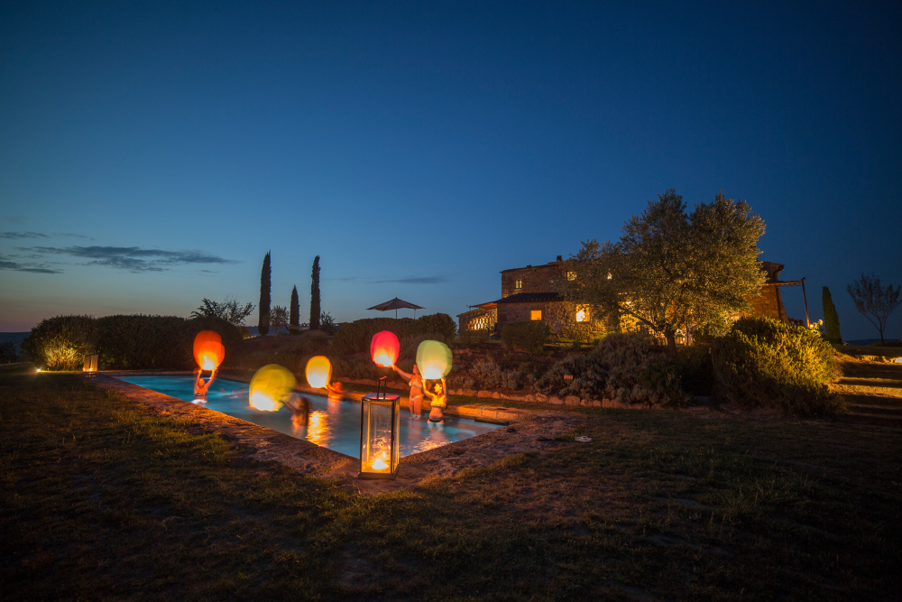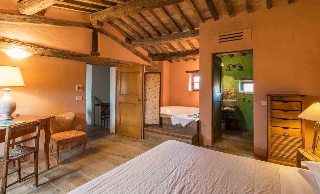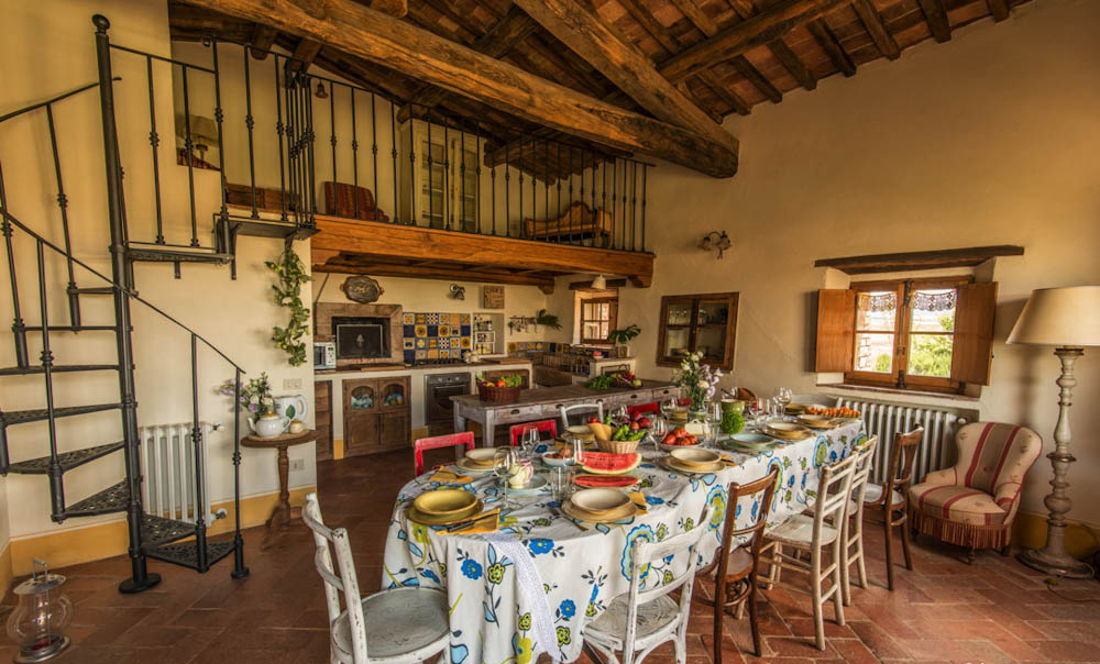 Ferme toscane rustique avec un superbe jardin qui donne sur les montagnes. Cet espace vert a une grande piscine et est meublée avec des espaces repas couverts, un lit à baldaquin d’extérieur et des chaises longues, ce qui en fait un endroit adorable pour se détendre en famille et entre amis.