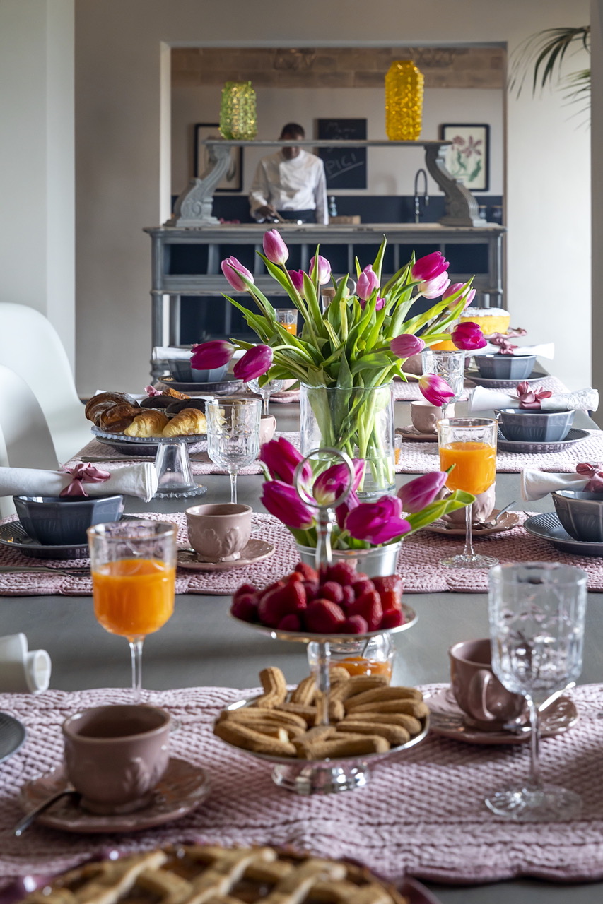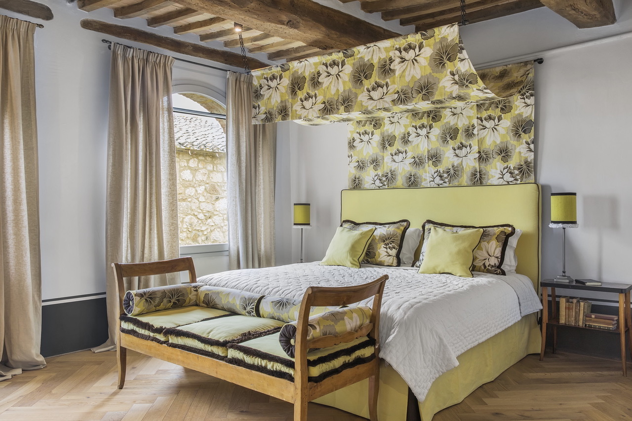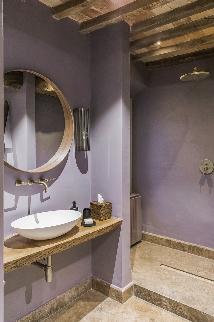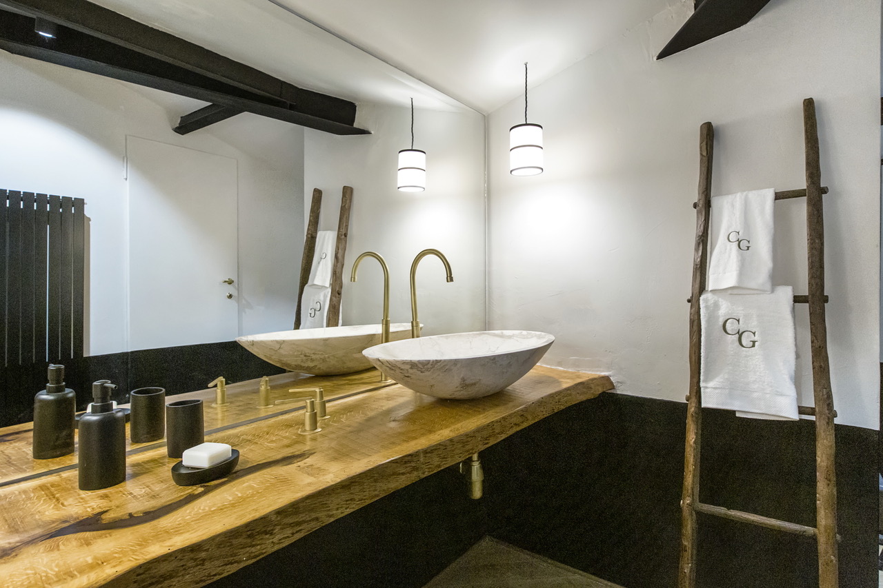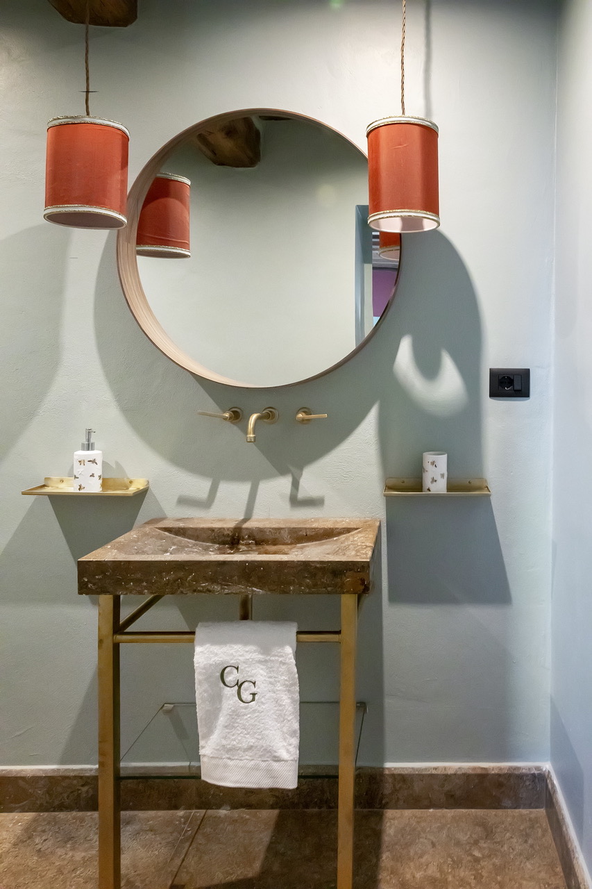 A l’intérieur, un deuxième spectacle opère : vous découvrirez une décoration sur mesure, consciencieusement choisie pour mettre en valeur l’architecture de la maison. Sous la voûte du salon, une cheminée très moderne et complètement ouverte vous attend pour les soirs d’hiver. La grande table à manger d’époque en bois est contrastée par des chaises design, formant ainsi un mélange vintage et contemporain qui fait l’identité unique de cette belle maison de campagne. Les poutres apparentes et les plafonds d’origine confèrent à la demeure une ambiance chaleureuse et sont surtout la preuve de son authenticité. Les 7 chambres ont toutes été pensées diversement et sont décorées dans des couleurs différentes pour créer plusieurs ambiances… À vous de trouver celle qui vous conviendra le mieux !