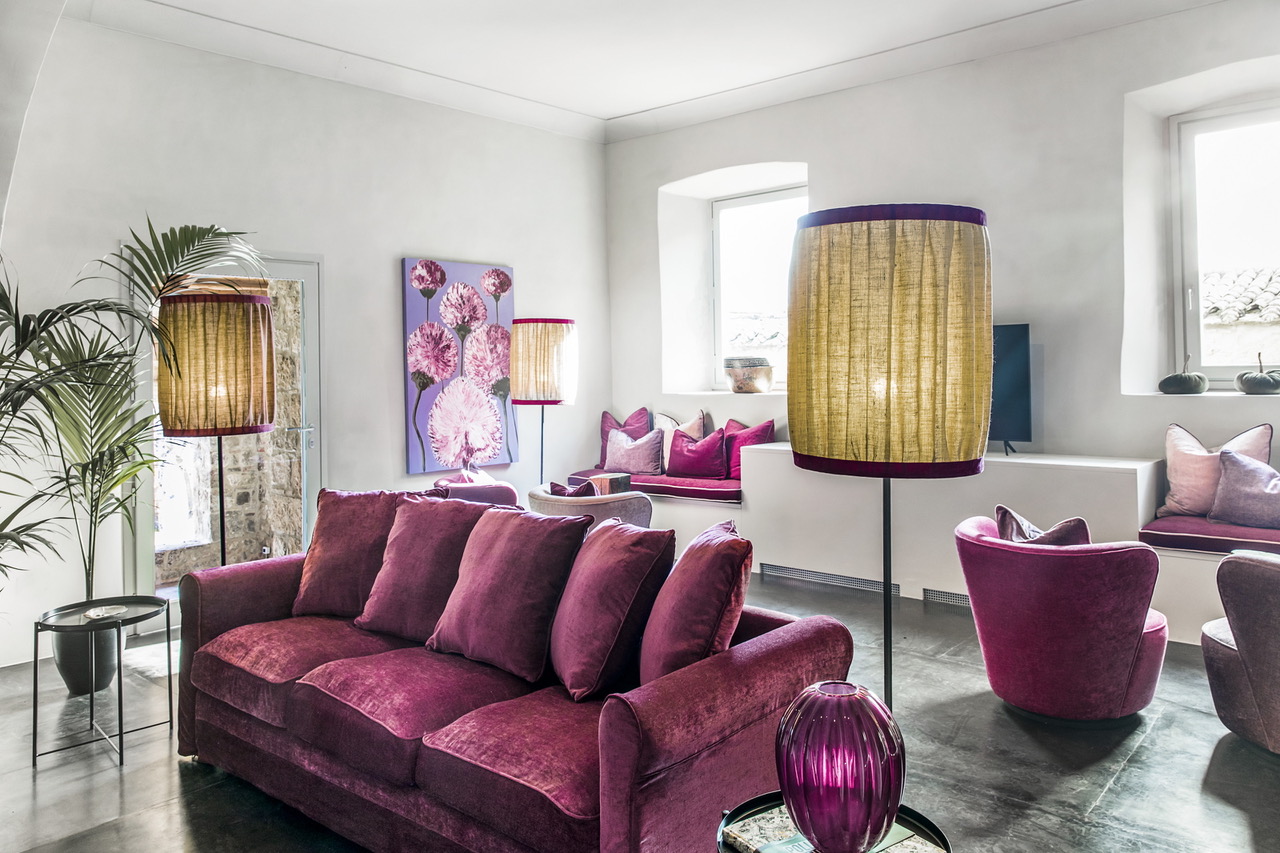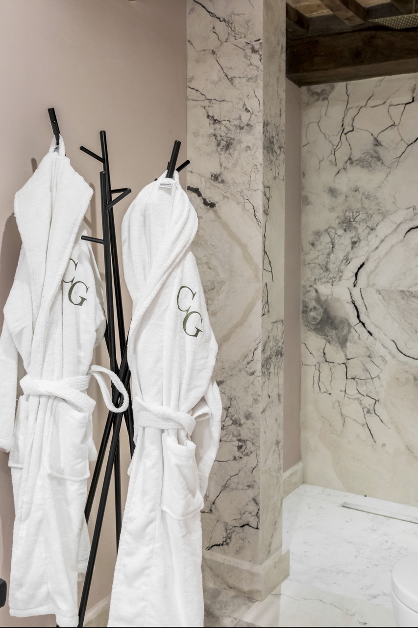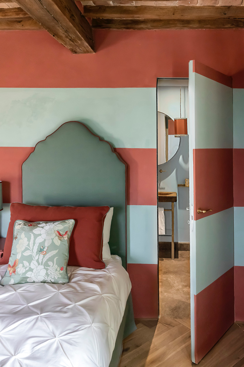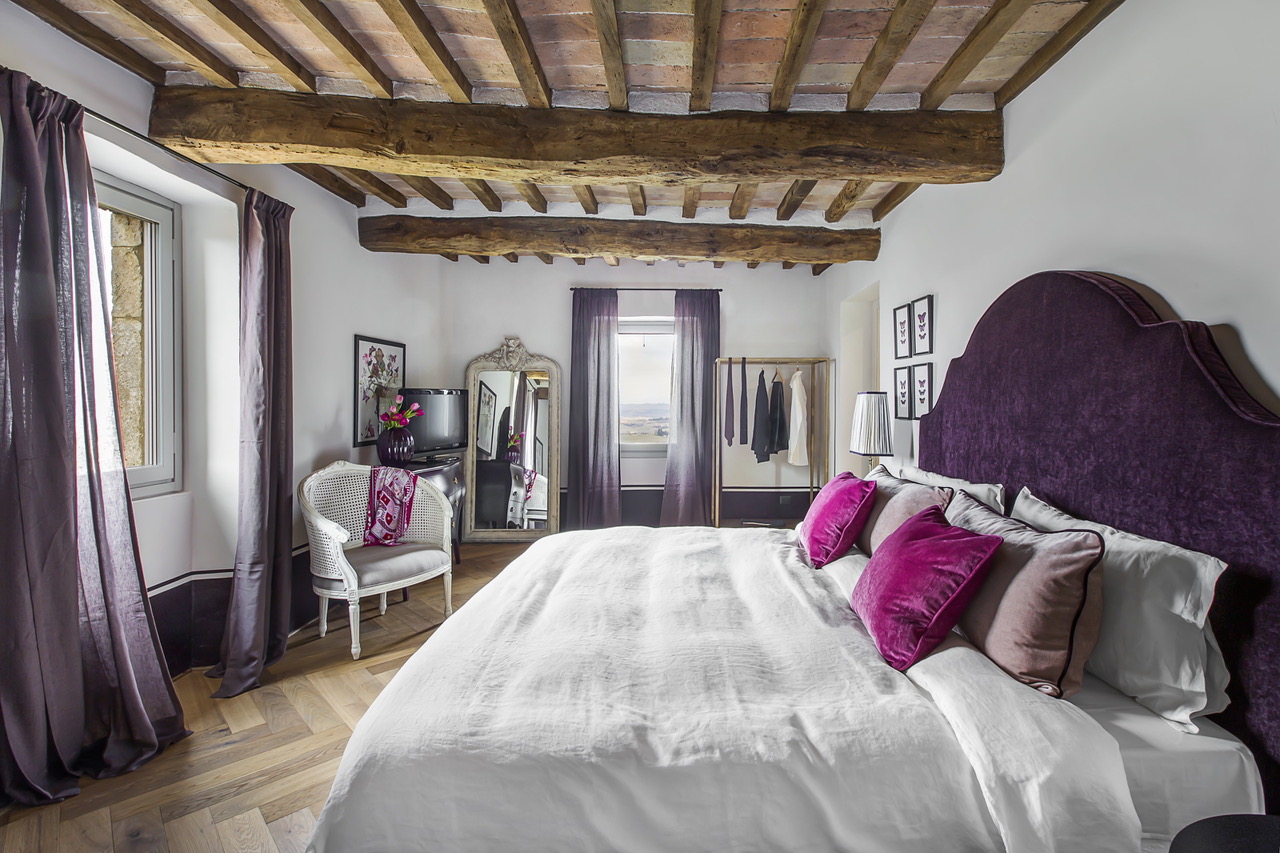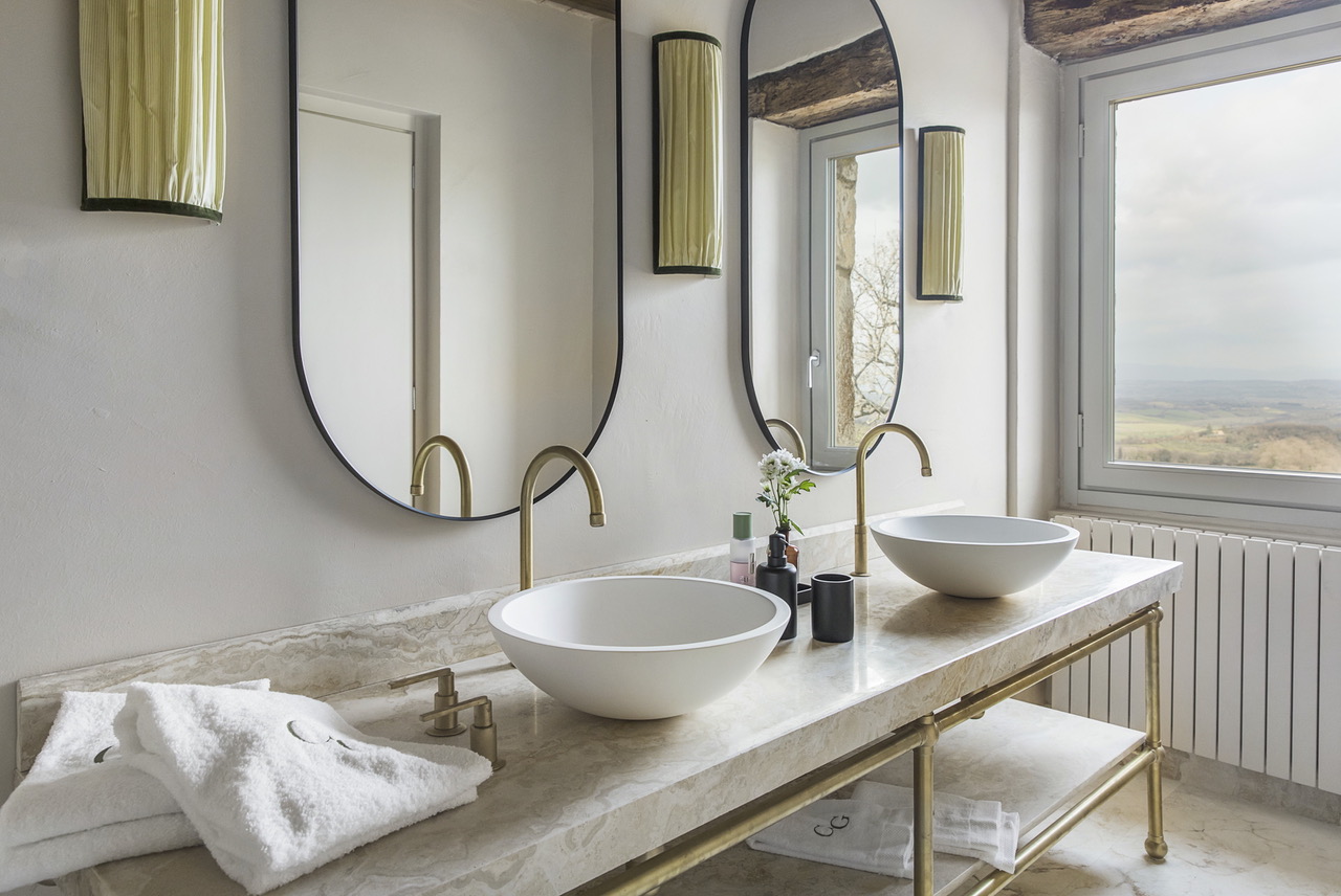 A l’intérieur, un deuxième spectacle opère : vous découvrirez une décoration sur mesure, consciencieusement choisie pour mettre en valeur l’architecture de la maison. Sous la voûte du salon, une cheminée très moderne et complètement ouverte vous attend pour les soirs d’hiver. La grande table à manger d’époque en bois est contrastée par des chaises design, formant ainsi un mélange vintage et contemporain qui fait l’identité unique de cette belle maison de campagne. Les poutres apparentes et les plafonds d’origine confèrent à la demeure une ambiance chaleureuse et sont surtout la preuve de son authenticité. Les 7 chambres ont toutes été pensées diversement et sont décorées dans des couleurs différentes pour créer plusieurs ambiances… À vous de trouver celle qui vous conviendra le mieux !