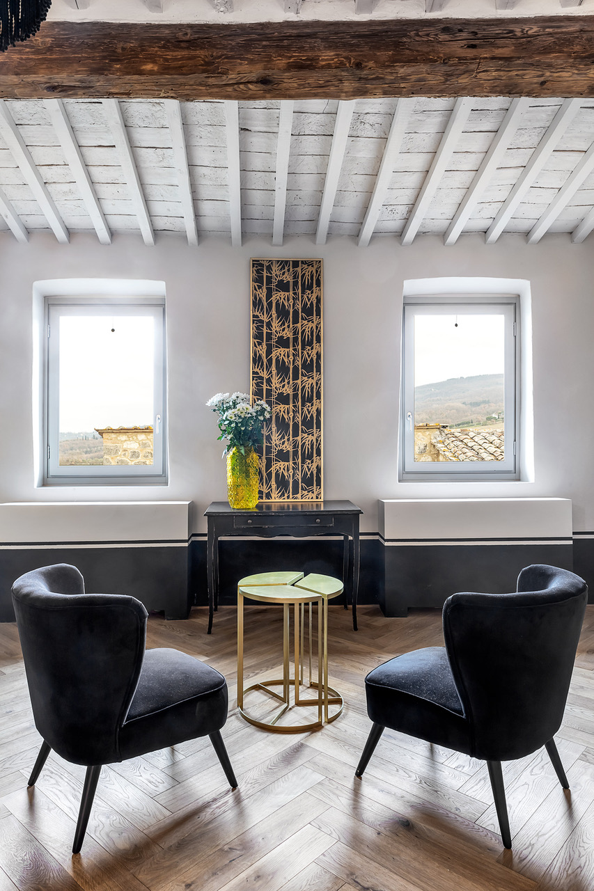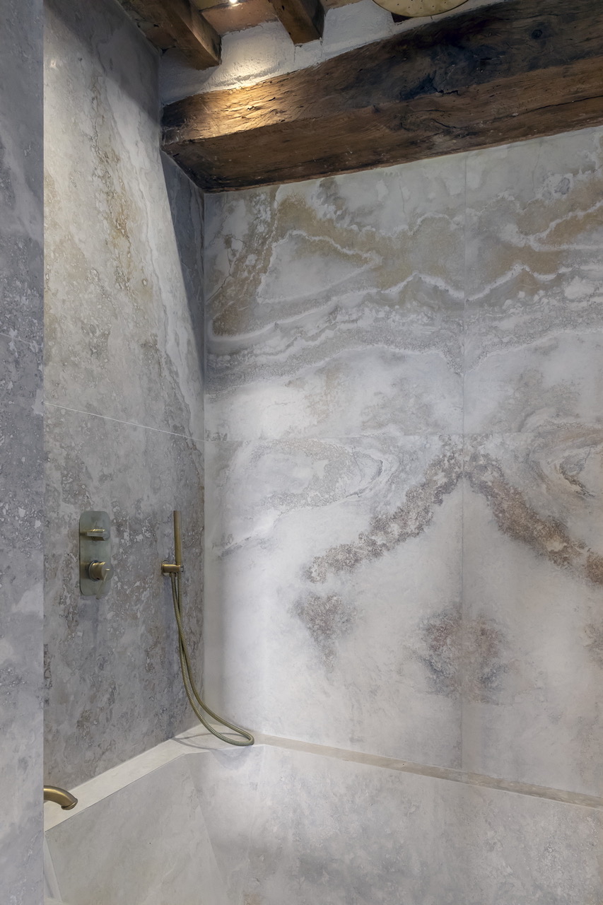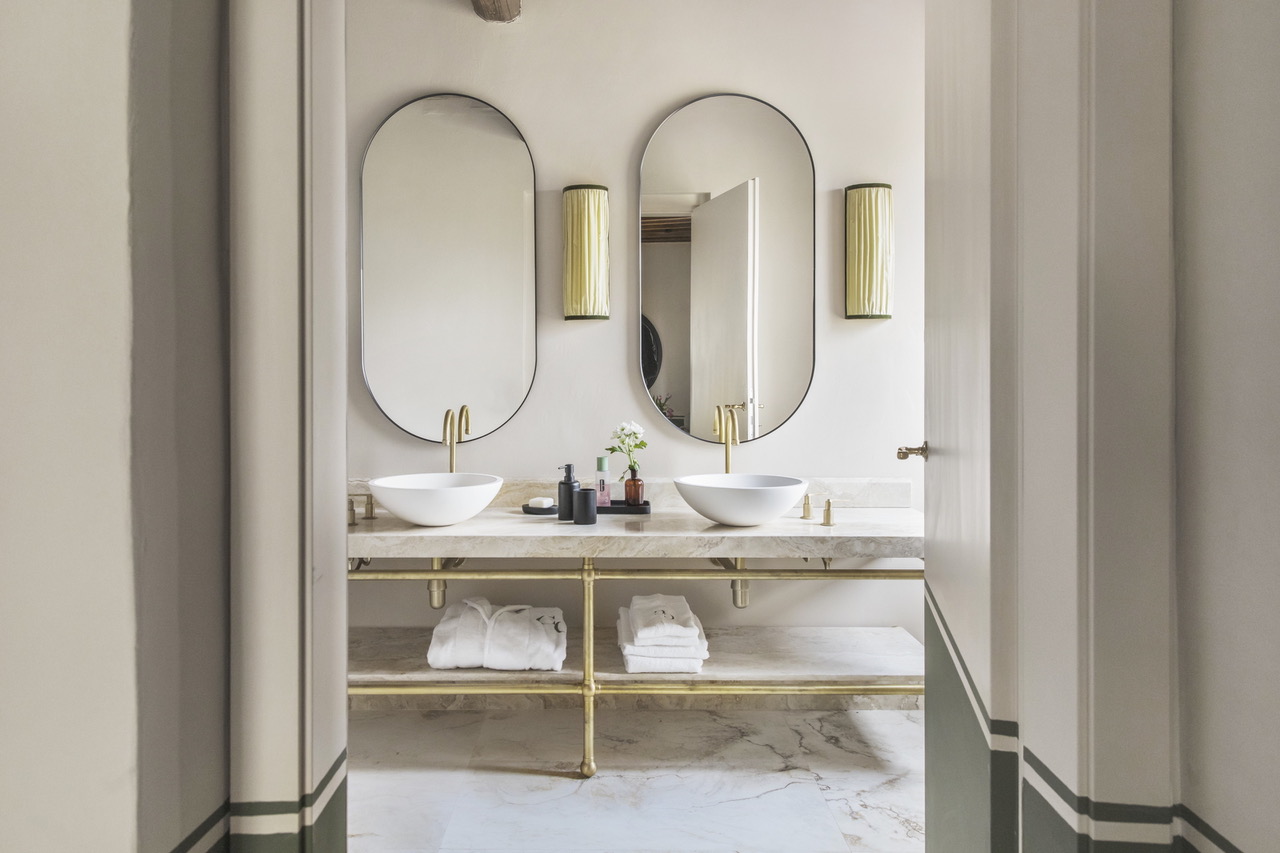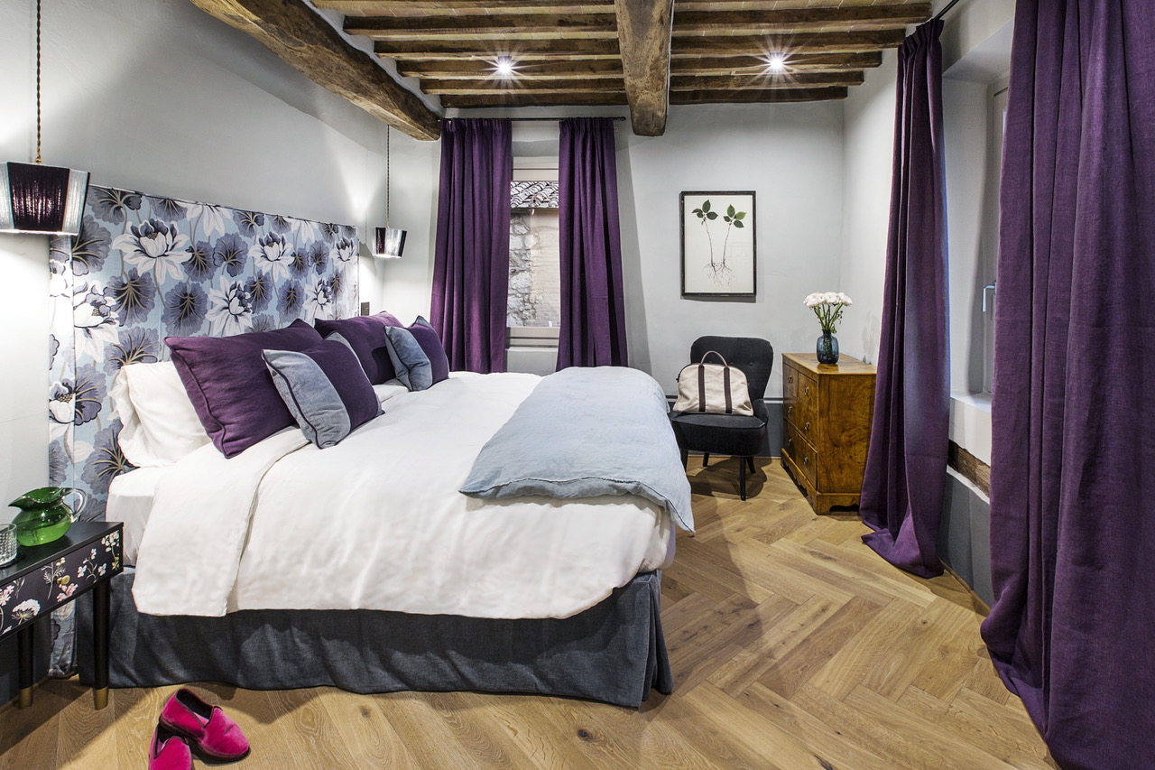 A l’intérieur, un deuxième spectacle opère : vous découvrirez une décoration sur mesure, consciencieusement choisie pour mettre en valeur l’architecture de la maison. Sous la voûte du salon, une cheminée très moderne et complètement ouverte vous attend pour les soirs d’hiver. La grande table à manger d’époque en bois est contrastée par des chaises design, formant ainsi un mélange vintage et contemporain qui fait l’identité unique de cette belle maison de campagne. Les poutres apparentes et les plafonds d’origine confèrent à la demeure une ambiance chaleureuse et sont surtout la preuve de son authenticité. Les 7 chambres ont toutes été pensées diversement et sont décorées dans des couleurs différentes pour créer plusieurs ambiances… À vous de trouver celle qui vous conviendra le mieux !