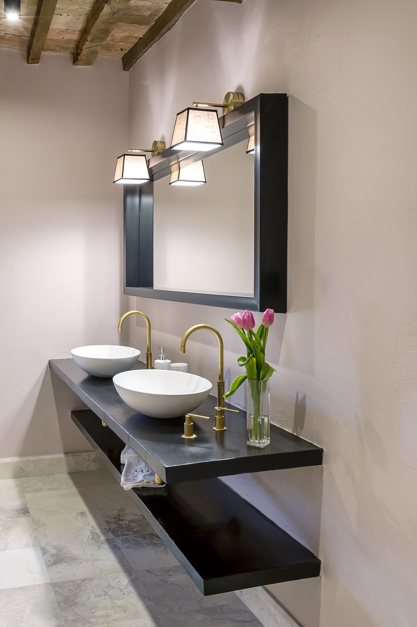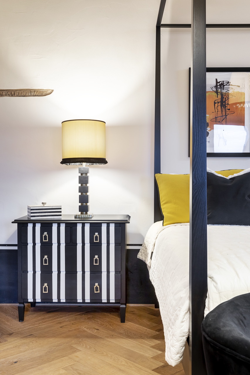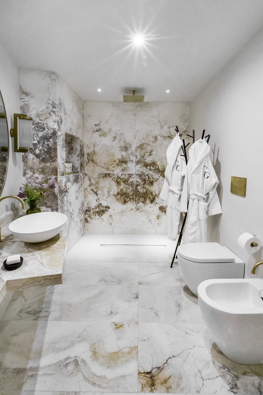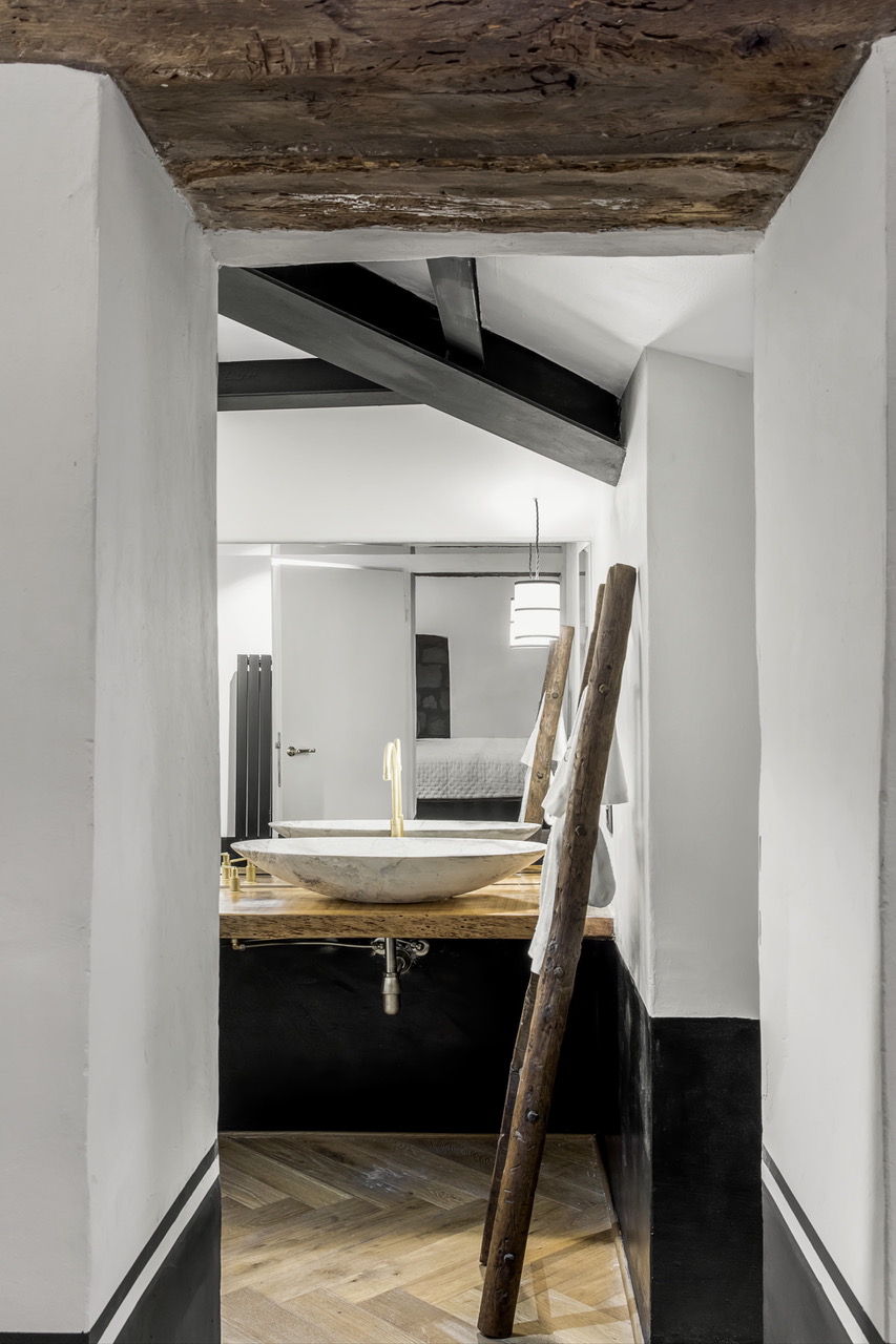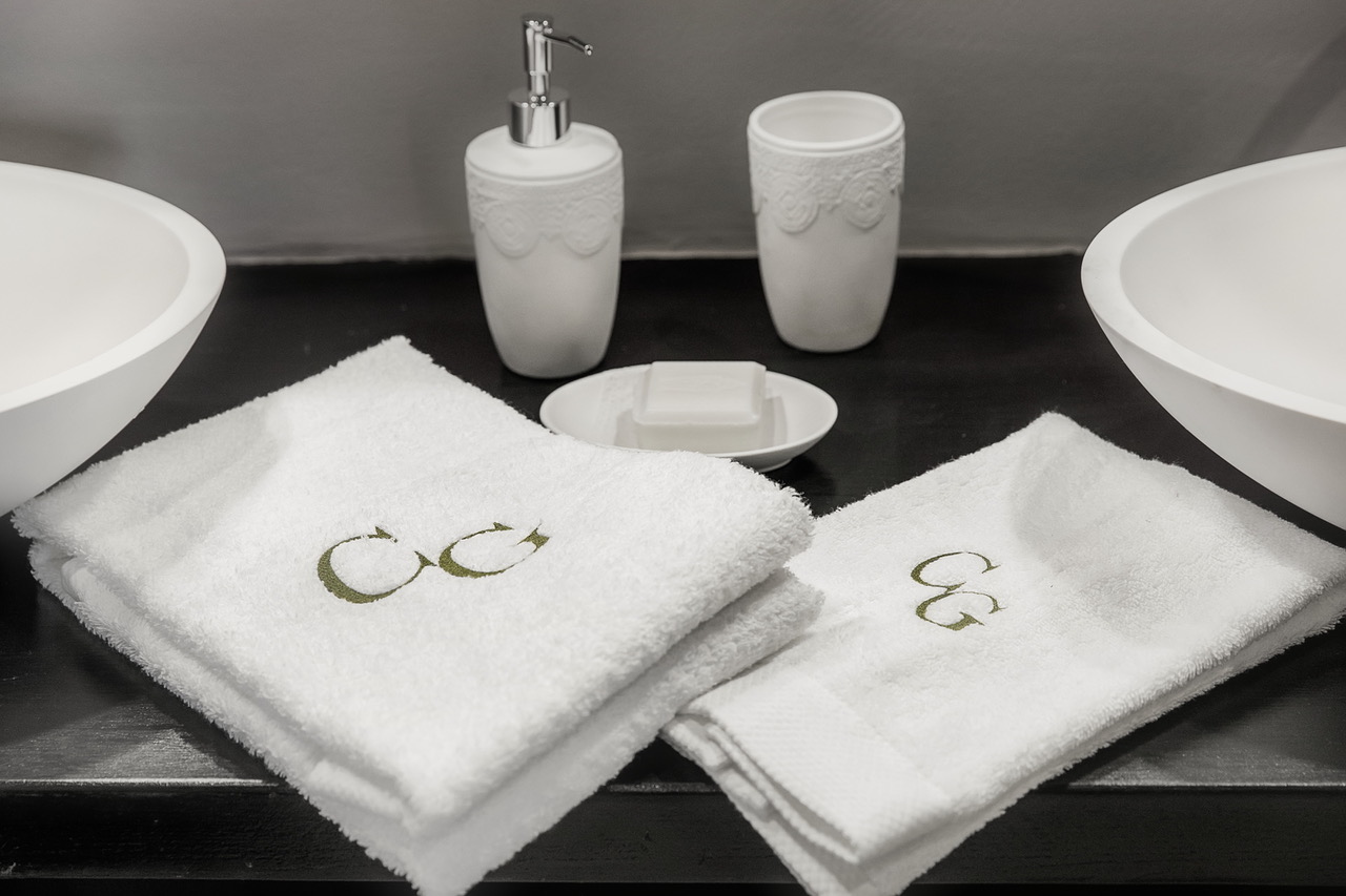 A l’intérieur, un deuxième spectacle opère : vous découvrirez une décoration sur mesure, consciencieusement choisie pour mettre en valeur l’architecture de la maison. Sous la voûte du salon, une cheminée très moderne et complètement ouverte vous attend pour les soirs d’hiver. La grande table à manger d’époque en bois est contrastée par des chaises design, formant ainsi un mélange vintage et contemporain qui fait l’identité unique de cette belle maison de campagne. Les poutres apparentes et les plafonds d’origine confèrent à la demeure une ambiance chaleureuse et sont surtout la preuve de son authenticité. Les 7 chambres ont toutes été pensées diversement et sont décorées dans des couleurs différentes pour créer plusieurs ambiances… À vous de trouver celle qui vous conviendra le mieux !