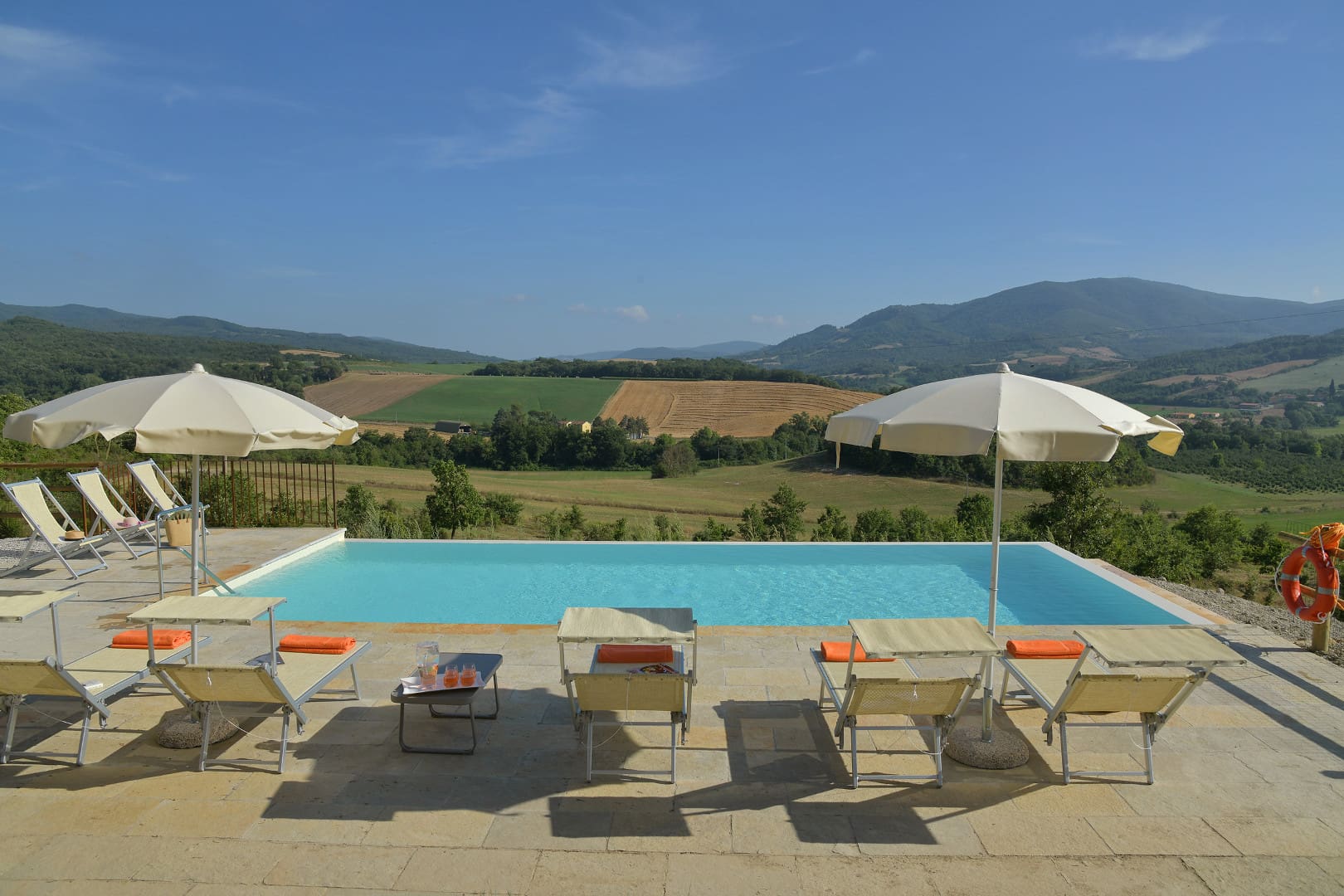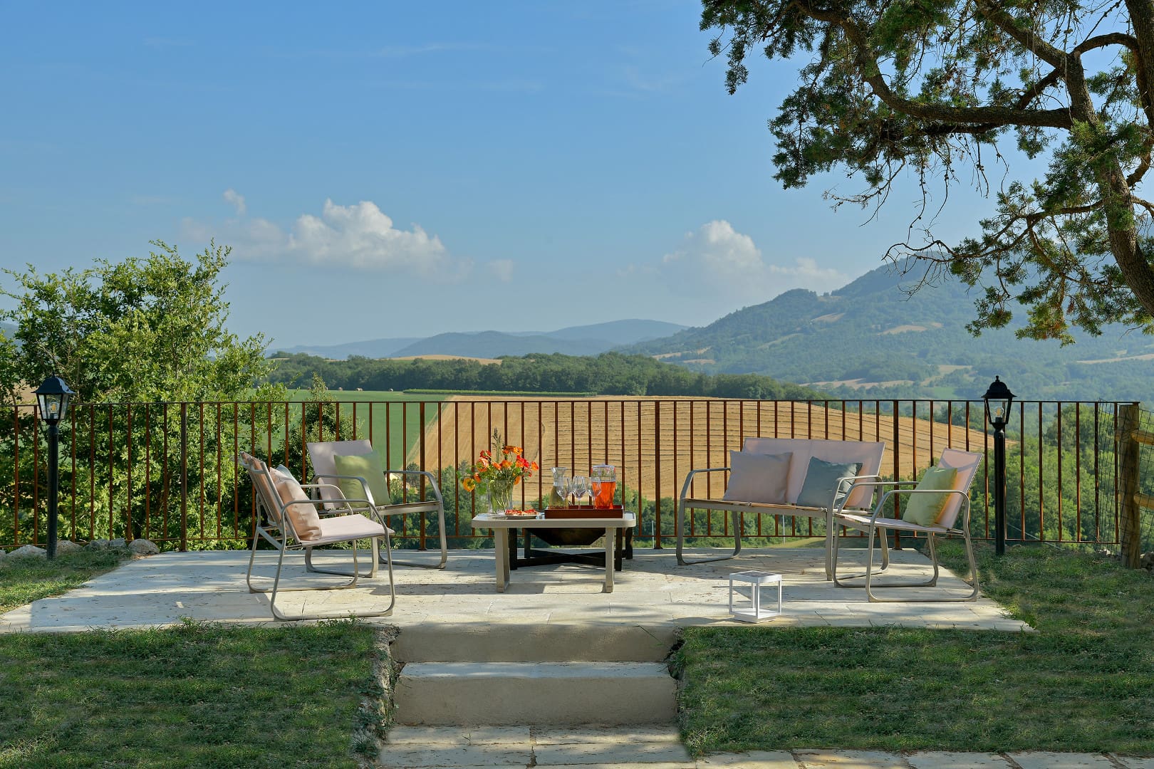 Terrasse aménagée avec coin salon, vue campagne, vue piscine