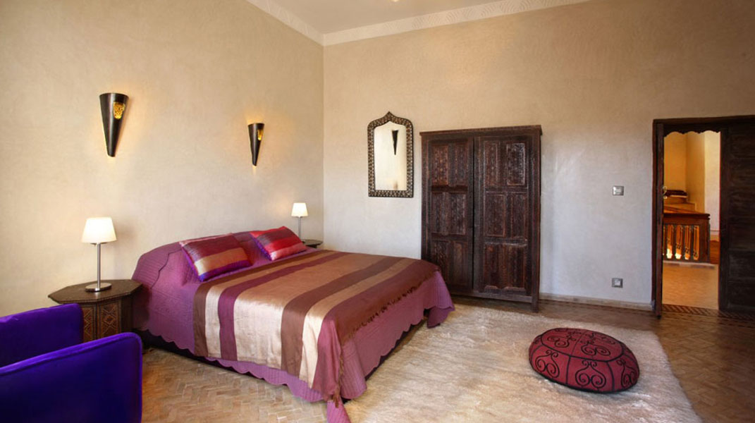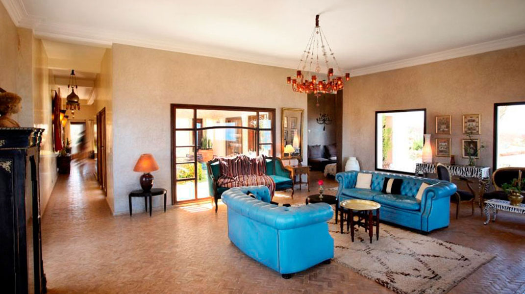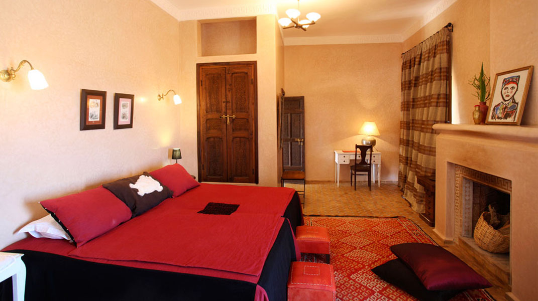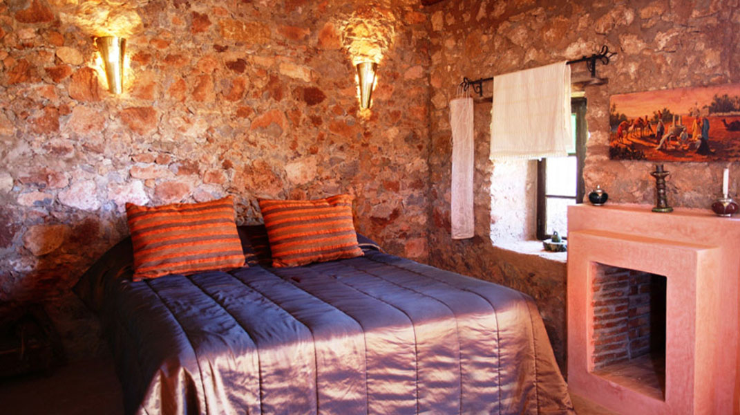 La villa est joliment décorée avec des portes traditionnelles, une cheminée en pierre et un choix textile authentique du Maroc.