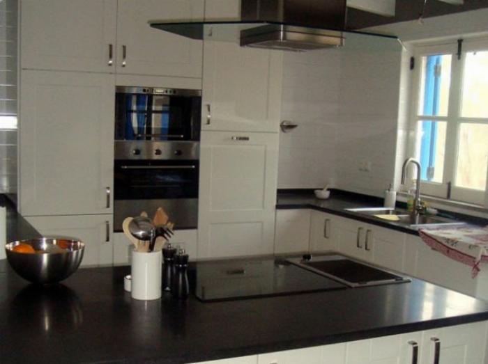 Cuisine avec réfrigérateur, four micro ondes, lave vaisselle, lave linge, plaques électriques, cafetière, grille pain